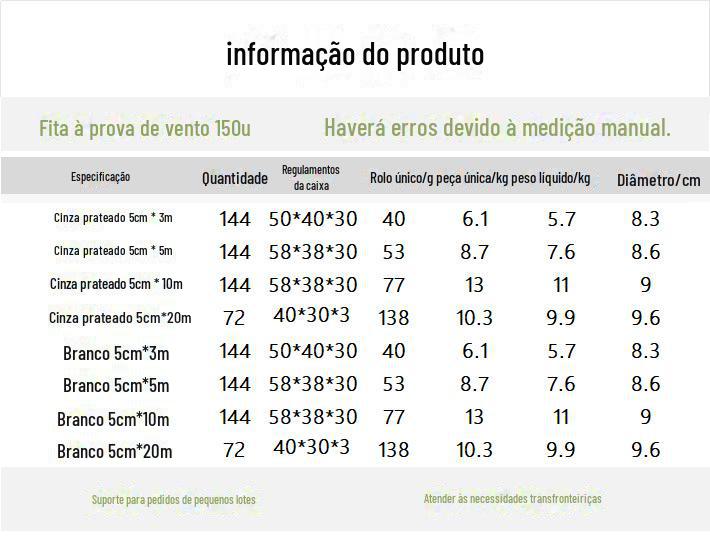 5cm * 20m (a box of 72 rolls), 5cm * 3m (a box of 144 rolls), 5cm * 5m (a box of 144 rolls), 5cm * 10m (a box of 144 rolls)