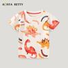 Camiseta infantil de moda europeia e americana, estampa de dinossauro, desenho animado, verão, camiseta de manga curta, malha de algodão, gola redonda, top infantil