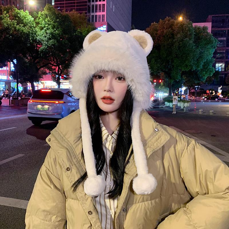 Chapéu de urso fofo estilo coreano Lei Feng para mulheres, chapéu de inverno com rosto pequeno e proteção auricular à prova de vento, chapéu de pelúcia quente e espesso
