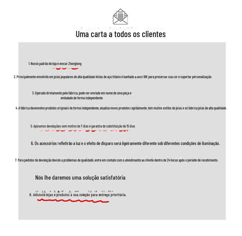 Se houver algum problema com a qualidade do produto, entre em contato conosco dentro de 24 horas após o recebimento da mercadoria.