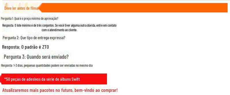 Prazo de entrega: Todos os pedidos serão enviados às 16h todos os dias. Pedidos feitos após as 16h serão enviados no dia seguinte. Por favor, comunique-se com o pessoal de atendimento ao cliente para saber o prazo de entrega dos adesivos personalizados.