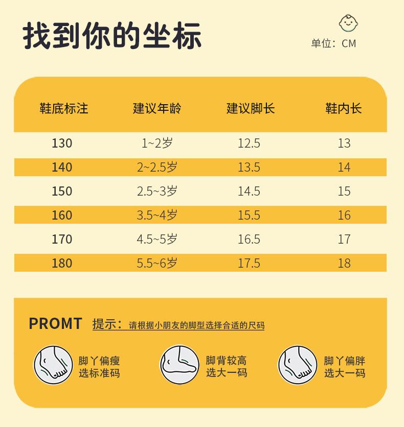 [130] Shoe length 13CM recommended foot length 12.5CM, [140] Shoe length 14CM recommended foot length 13.5CM, ...
