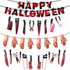Composição do conjunto: 1 conjunto de bandeira de puxar mão ensanguentada [papel] + 1 conjunto de bandeira de puxar faca ensanguentada [PVC] + 1 conjunto de pôster [tecido de poliéster 100D]