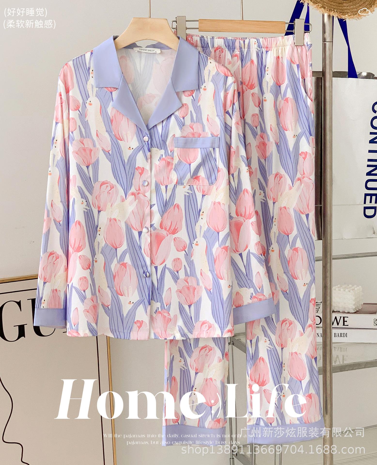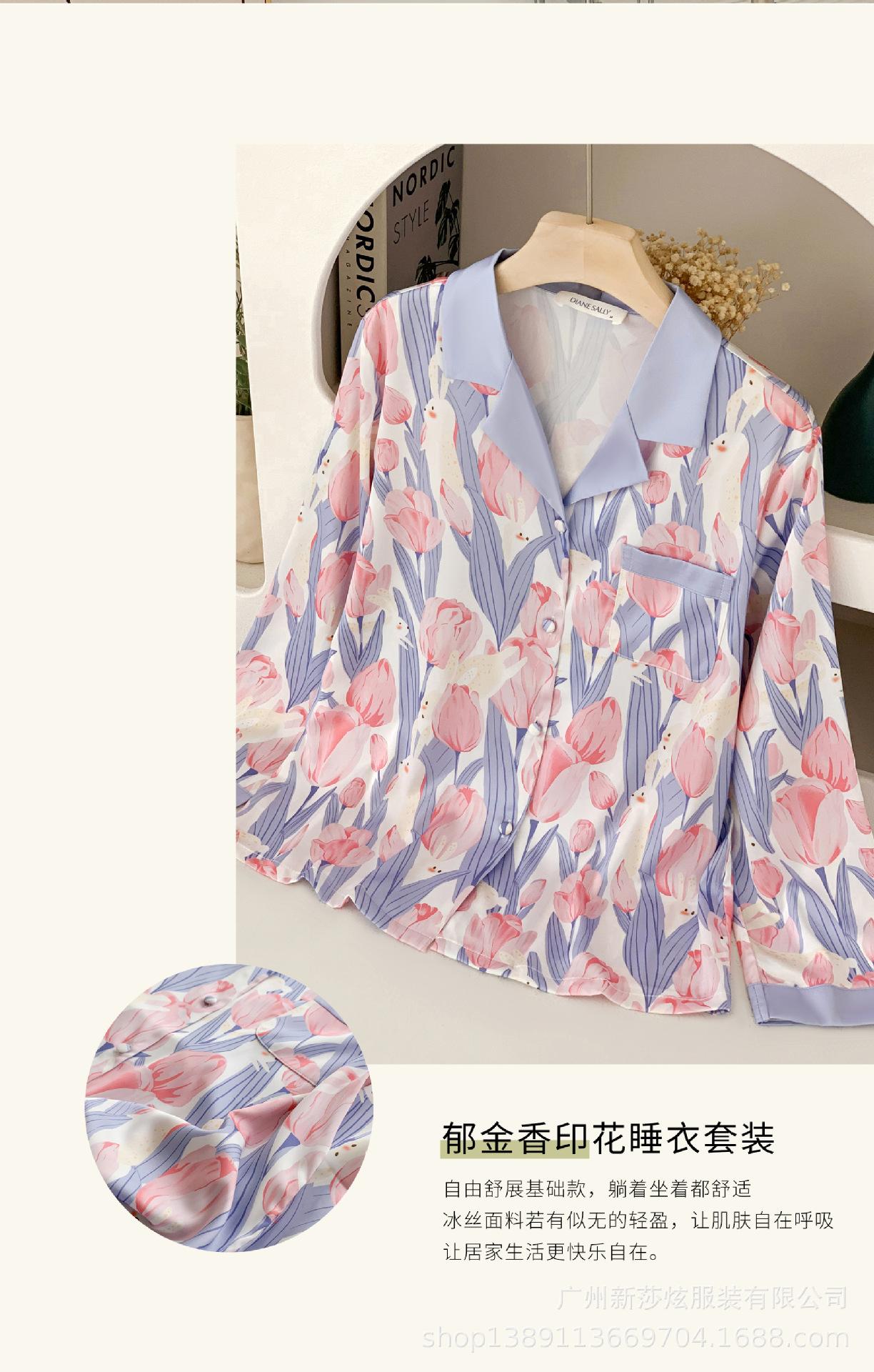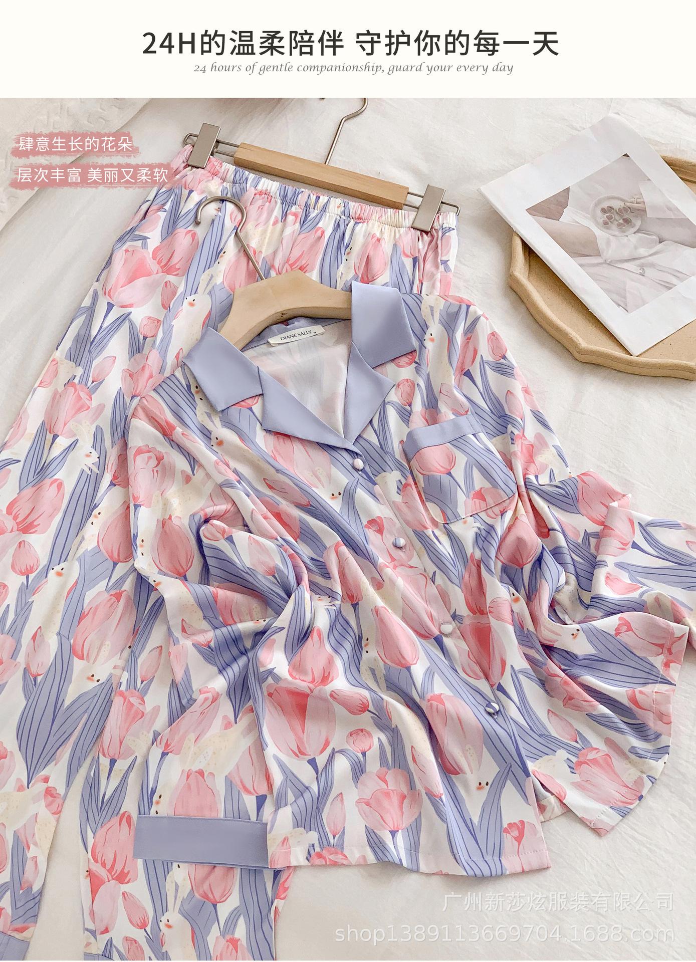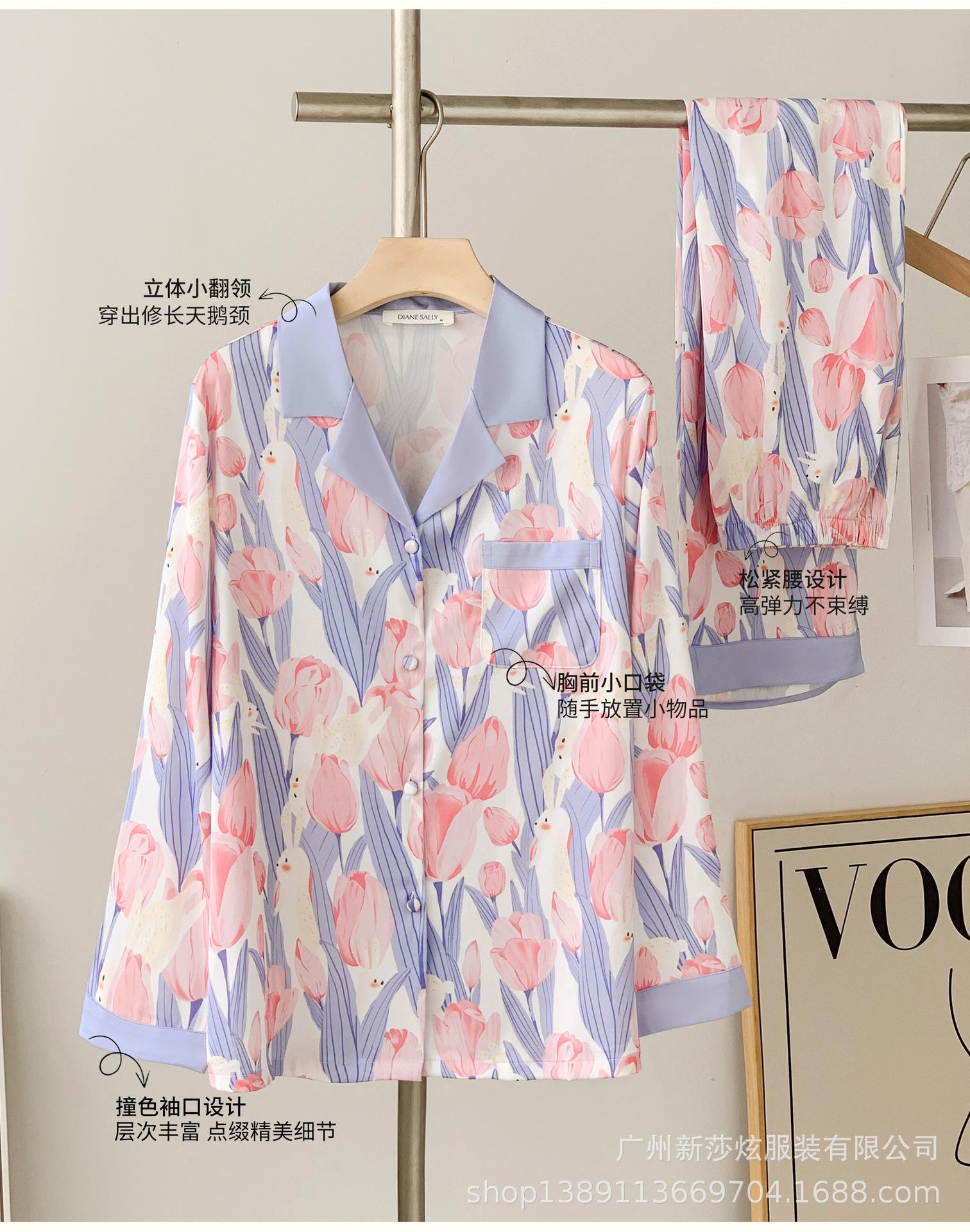 Pijama Doce Fina de Seda Gelo e Neve com Estampa de Tulipa Personalizada Feminina Estampada Roupa de Casa Conjunto Calça Manga Longa Atacado