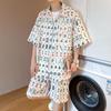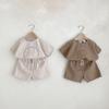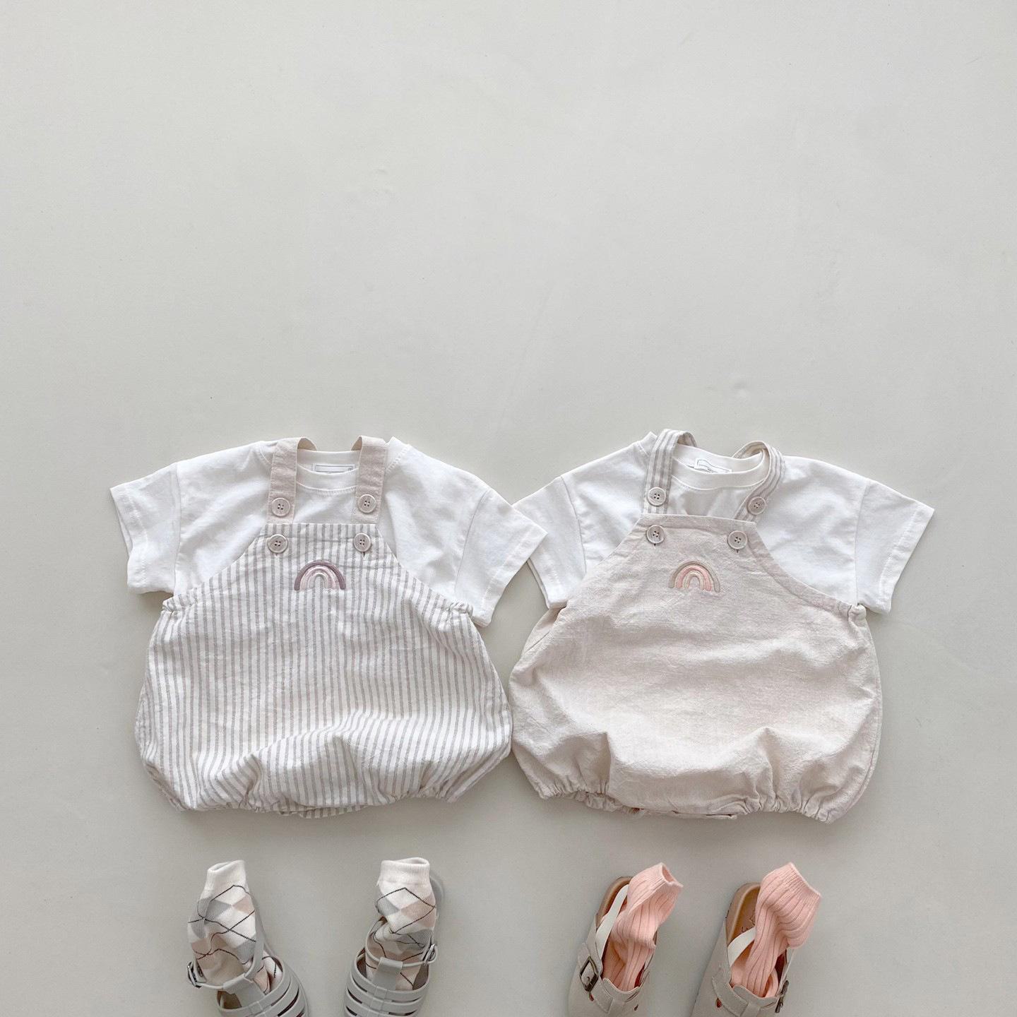 Ins versão coreana de verão masculino e feminino bebê fino algodão manga curta camiseta + arco-íris bordado tiras terno de duas peças moda
