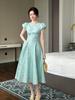 Vestido midi transfronteiriço de cor sólida com decote profundo e estilo étnico, cintura alta, cor sólida, elegante, para viagem, manga comprida