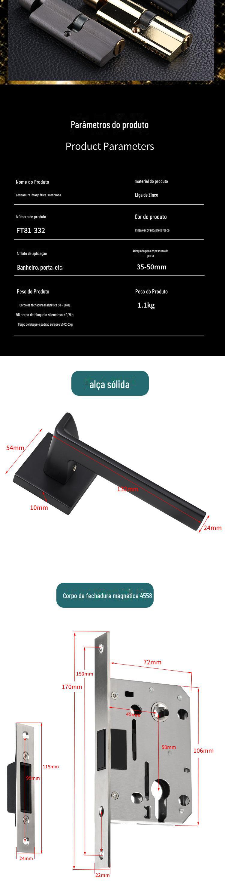Corpo de fechadura magnética silenciosa de liga de alumínio personalizada, maçaneta dividida para porta, estilo europeu, maçaneta para porta interna de banheiro