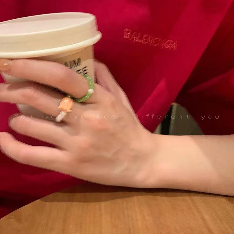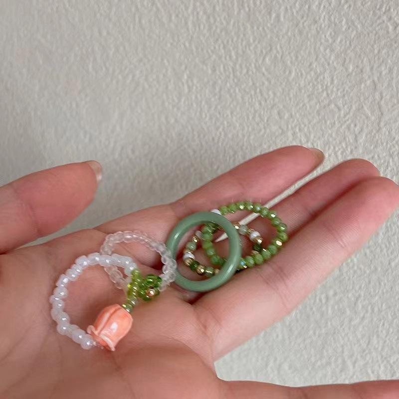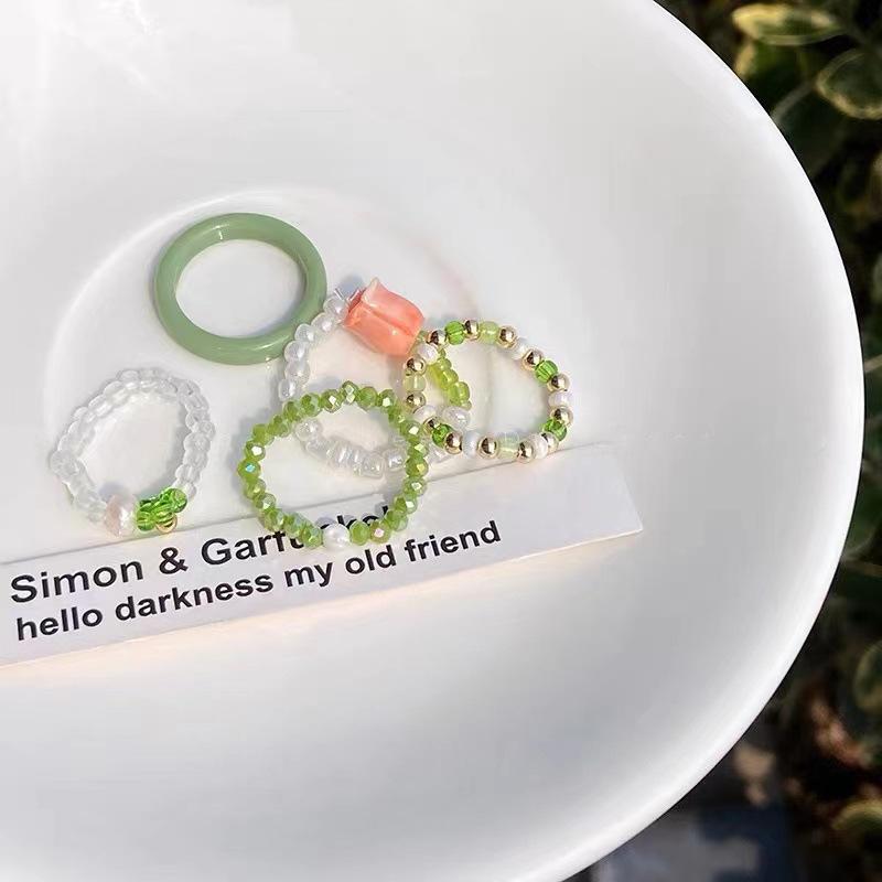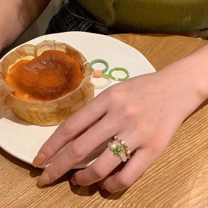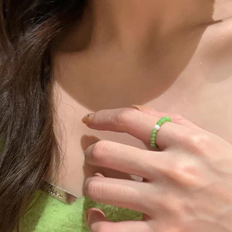 Anel de Flor de Pérola de Cristal Verde para Mulheres Verão Estilo Ins Design de Nicho Fashionable Anel de Dedo Indicador Contas