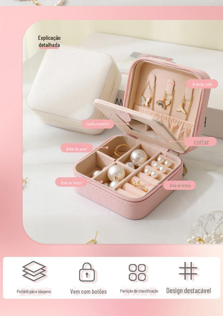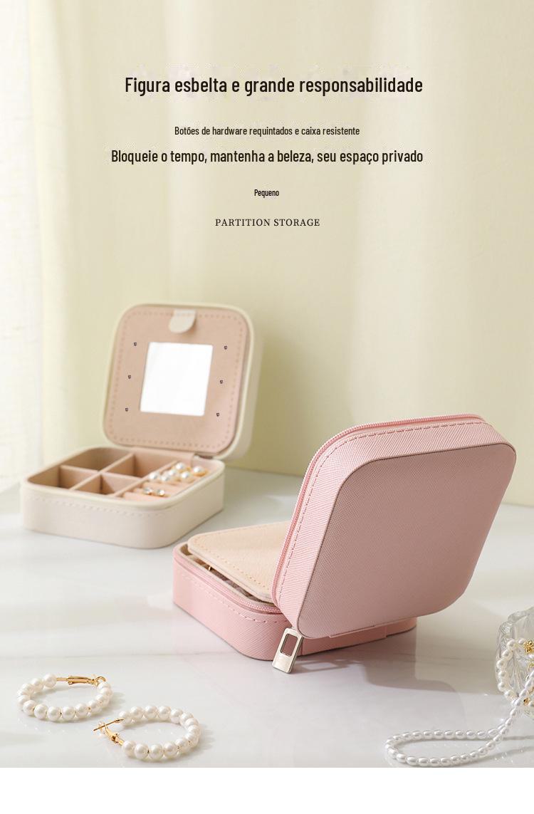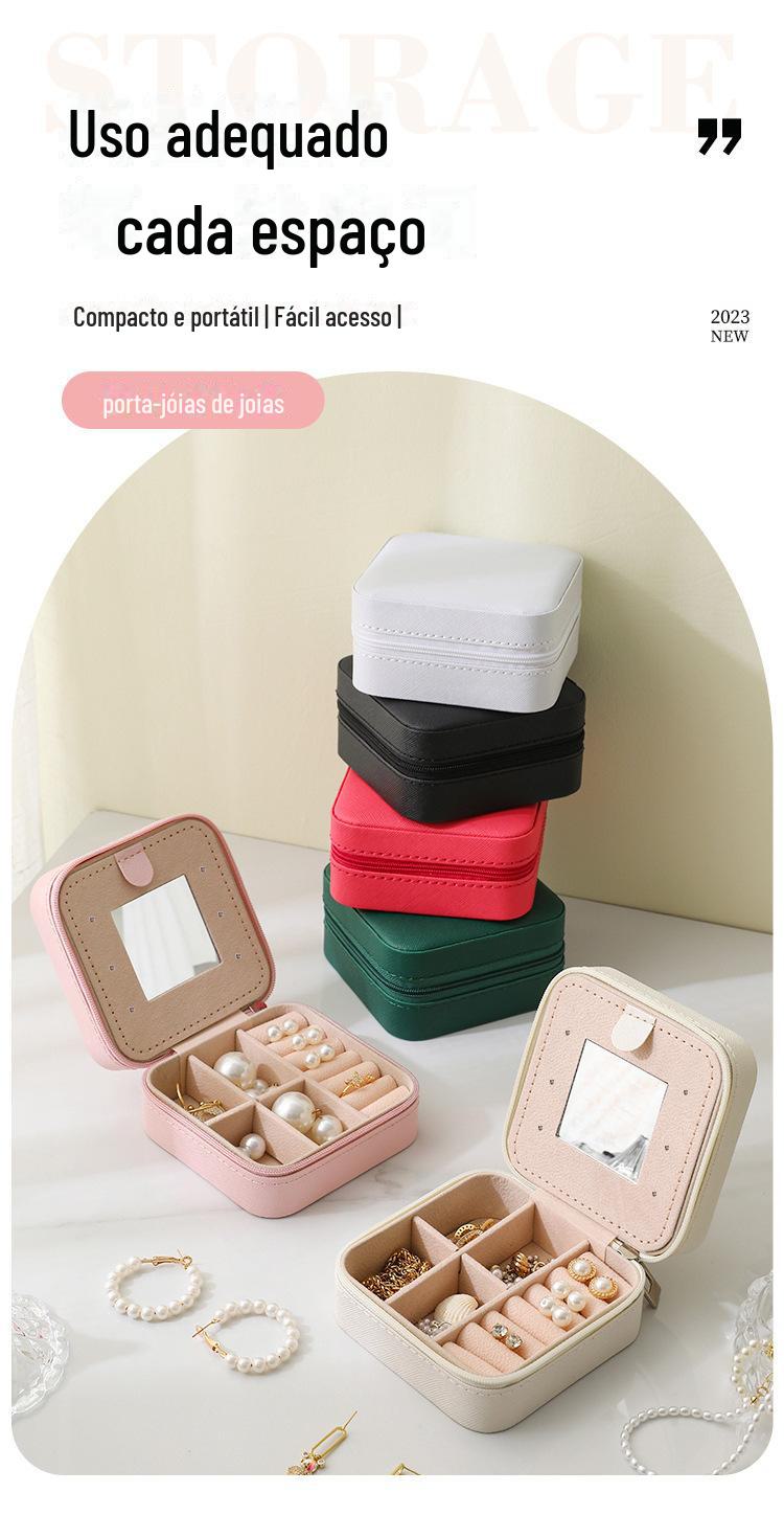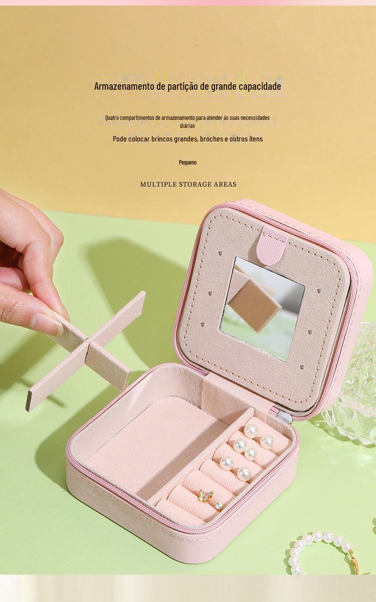 Caixa de joias portátil para armazenamento de brincos, colares e anéis, caixa de joias antioxidação, caixa de armazenamento de joias com espelho