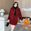 Foto real terno vermelho estilo pequeno perfumado outono e inverno 2025 novo pequeno temperamento estilo socialite saia de duas peças