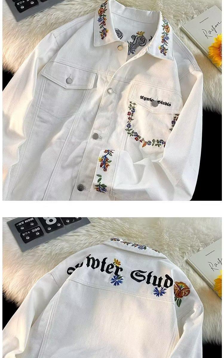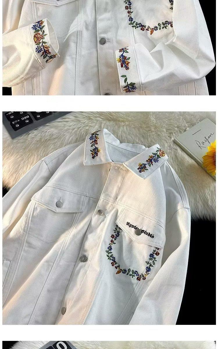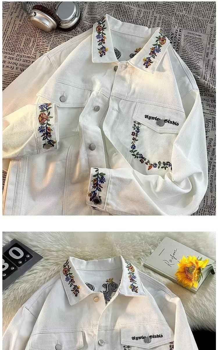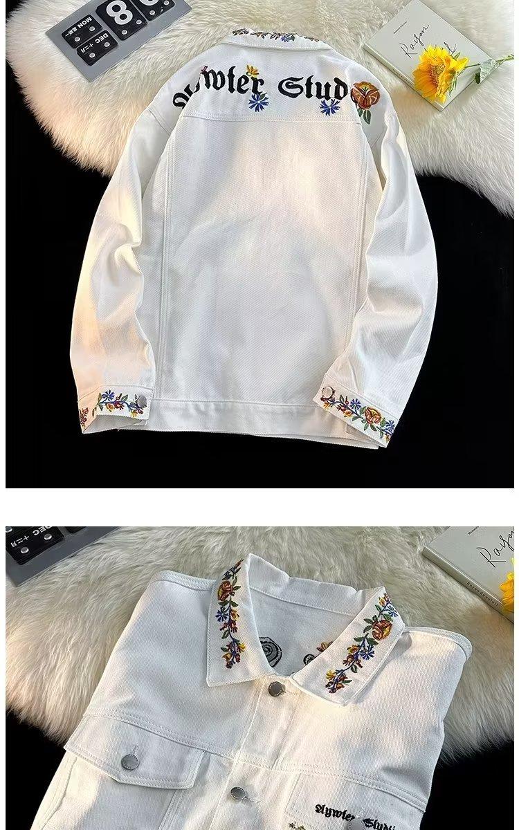 National Fashion Retro Heavy Industry Bordado Jaqueta Denim Branca para Homens e Mulheres Primavera e Outono Novo Design Sense Lassel Workwear Jaqueta