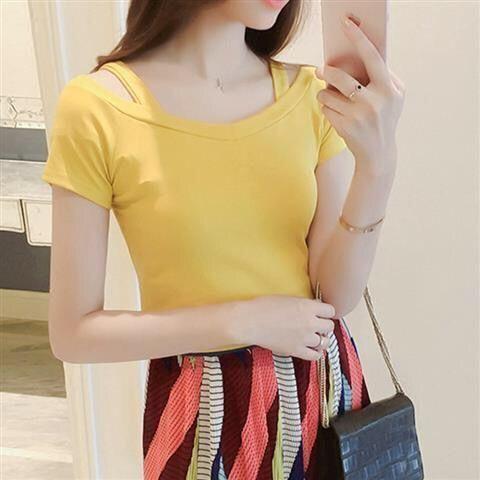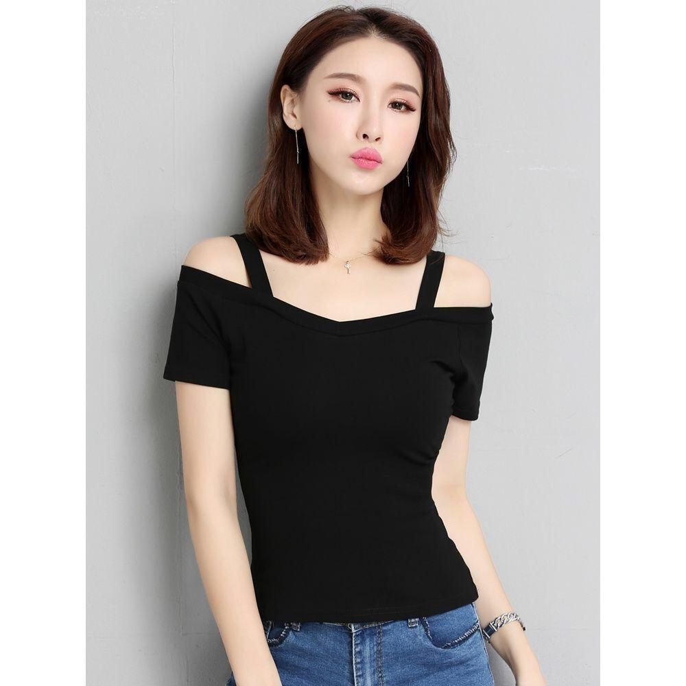 Camiseta Feminina 2025 Verão Estilo Coreano Preta G Ombro a Ombro Regata Manga Curta Camiseta Feminina Gola Canoa Ombro a Ombro Sexy Top Tendência