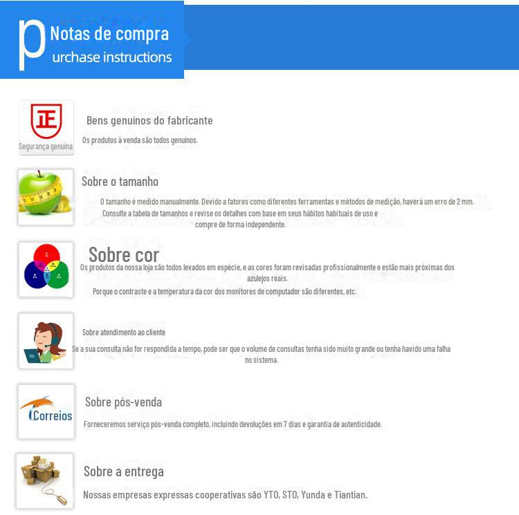 Forneceremos serviço pós-venda completo, incluindo devoluções em 7 dias e garantia de autenticidade.