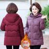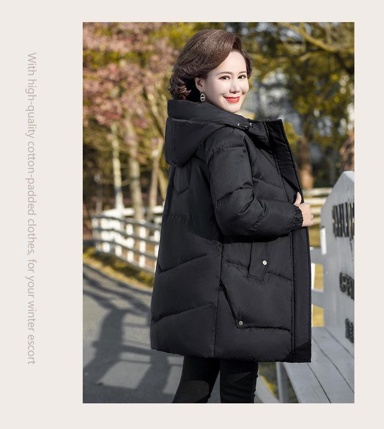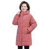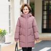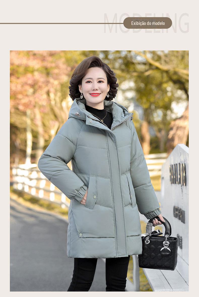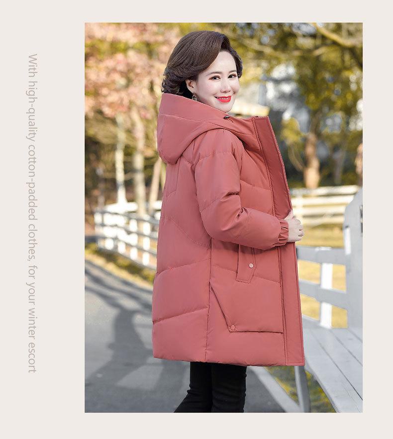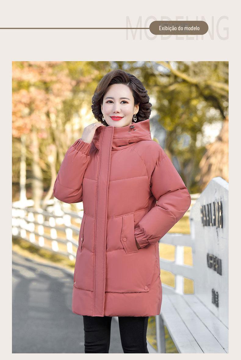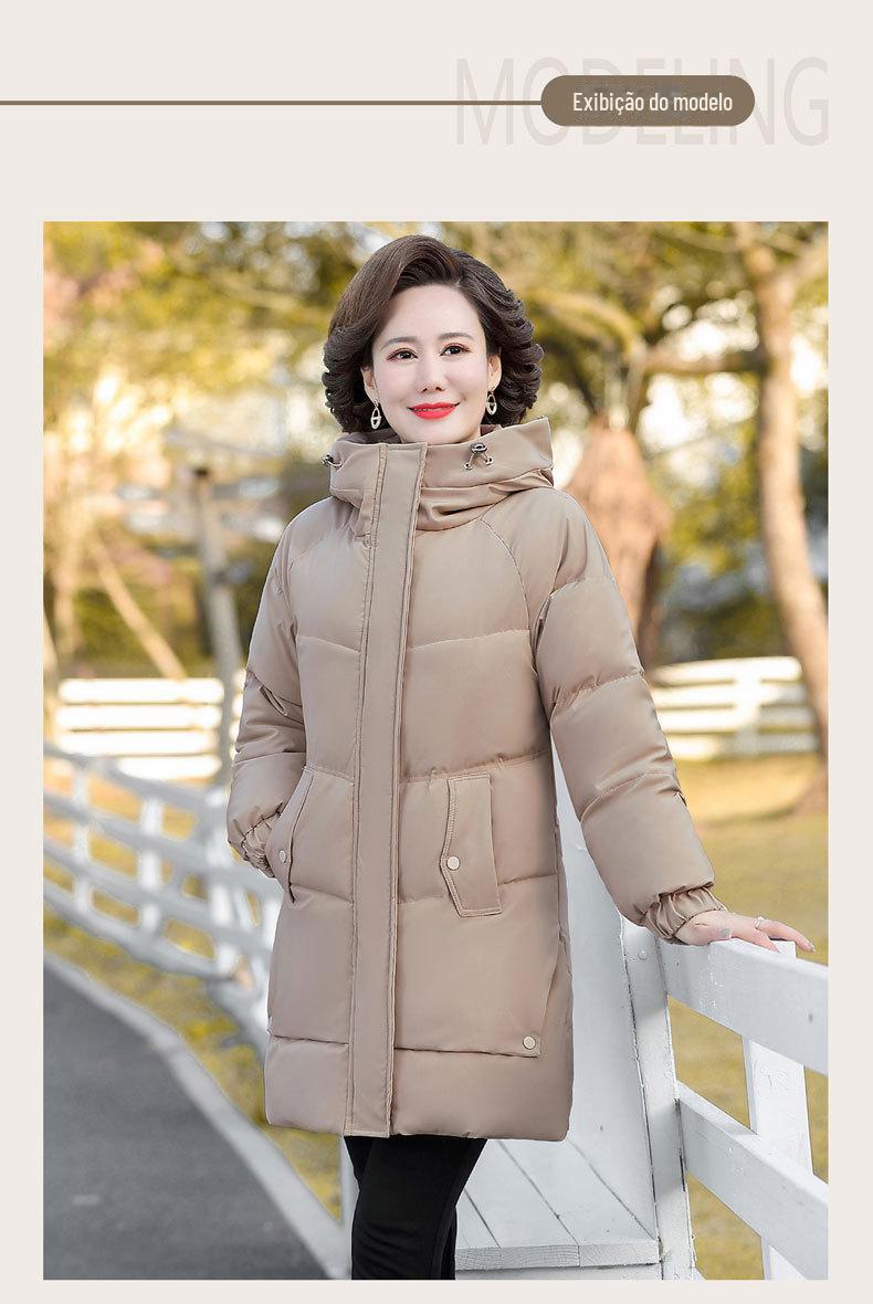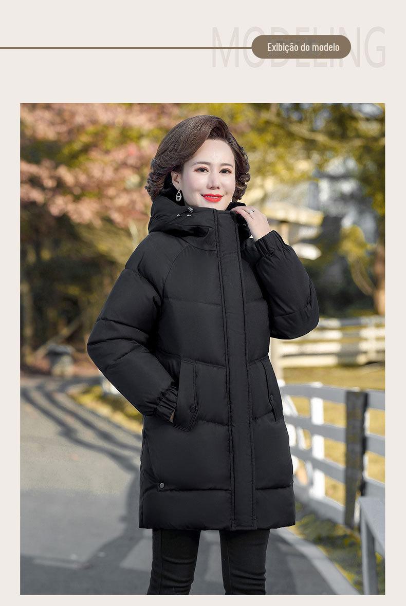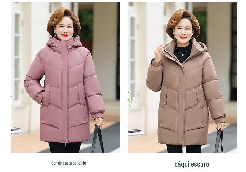 Casaco de inverno acolchoado de algodão para mãe, casaco com capuz espesso e forrado de lã de comprimento médio, casaco de inverno acolchoado de algodão para mulheres de meia-idade e idosas