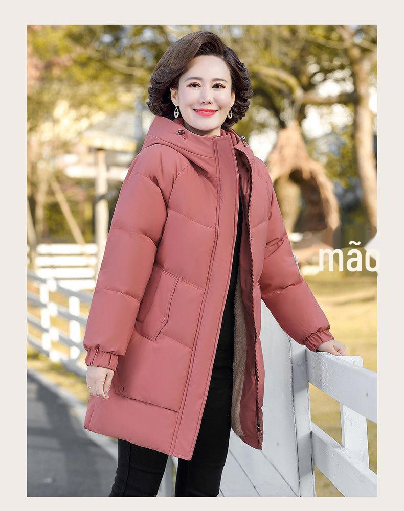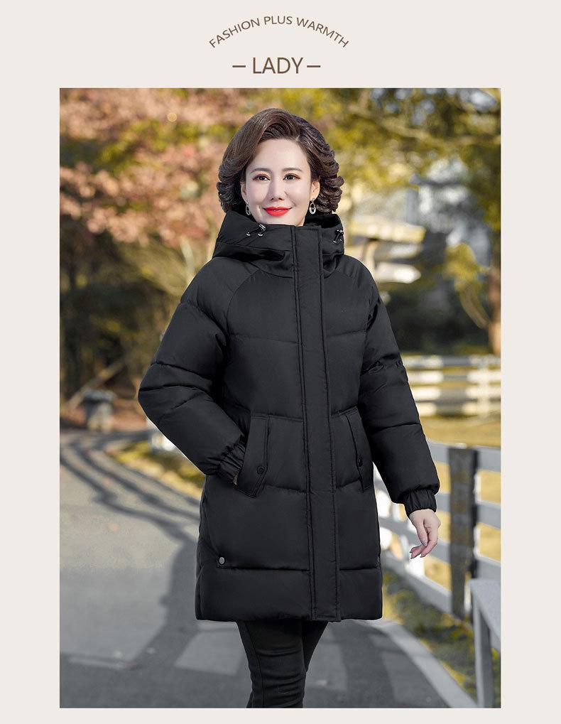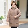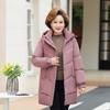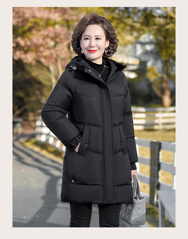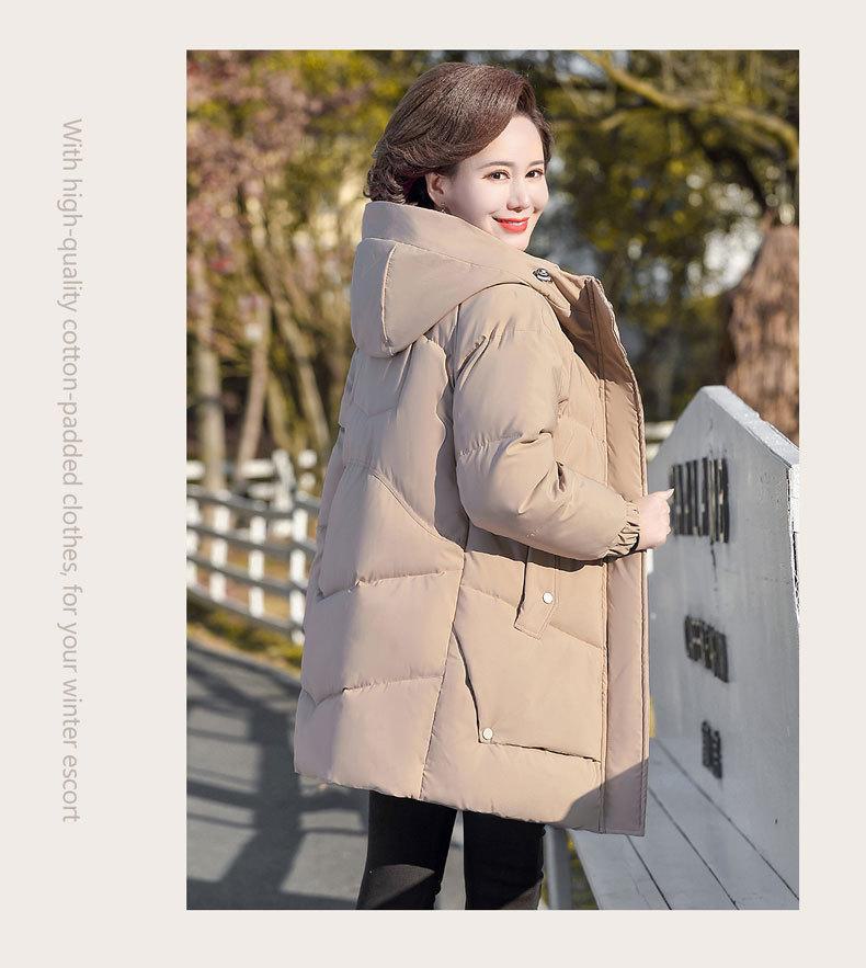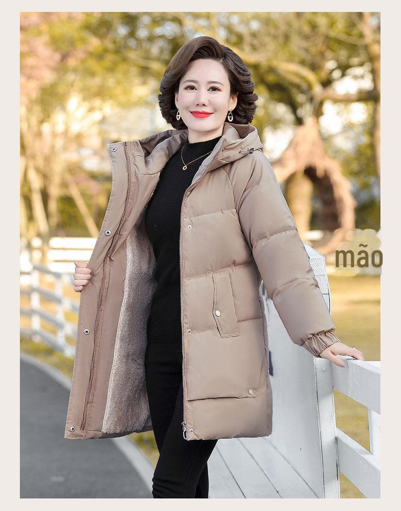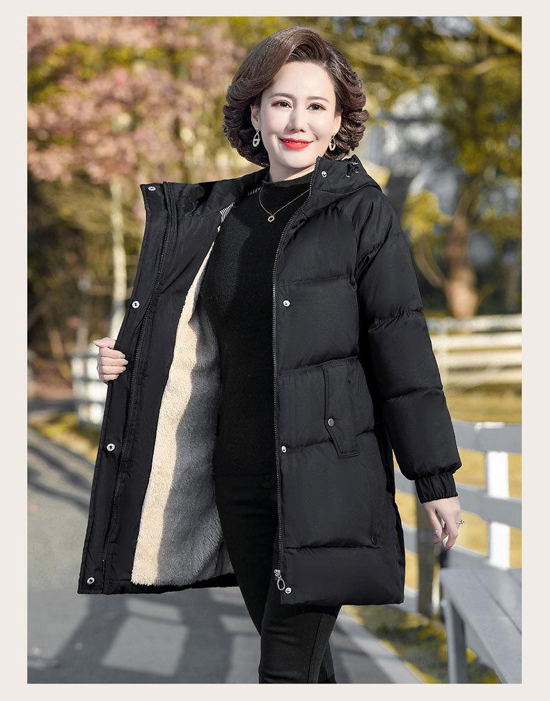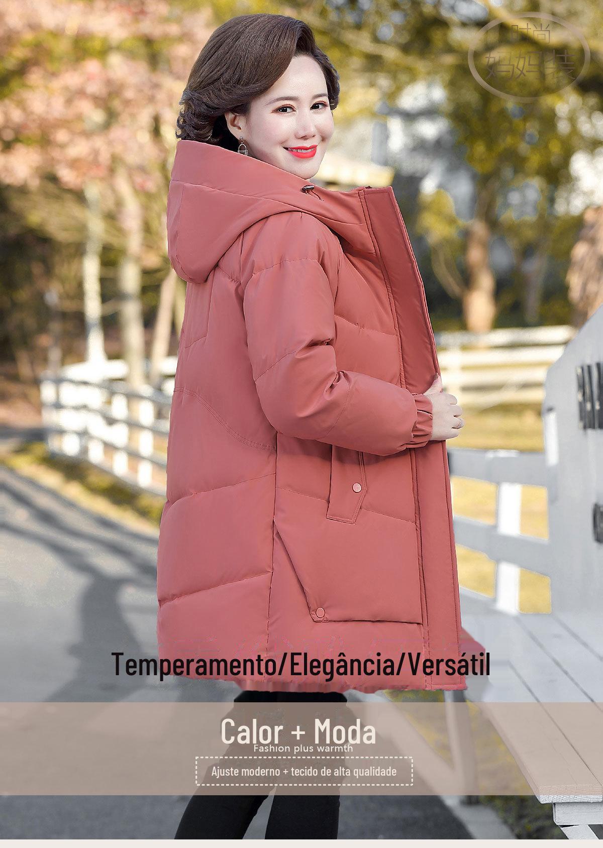 Casaco de inverno acolchoado de algodão para mãe, casaco com capuz espesso e forrado de lã de comprimento médio, casaco de inverno acolchoado de algodão para mulheres de meia-idade e idosas