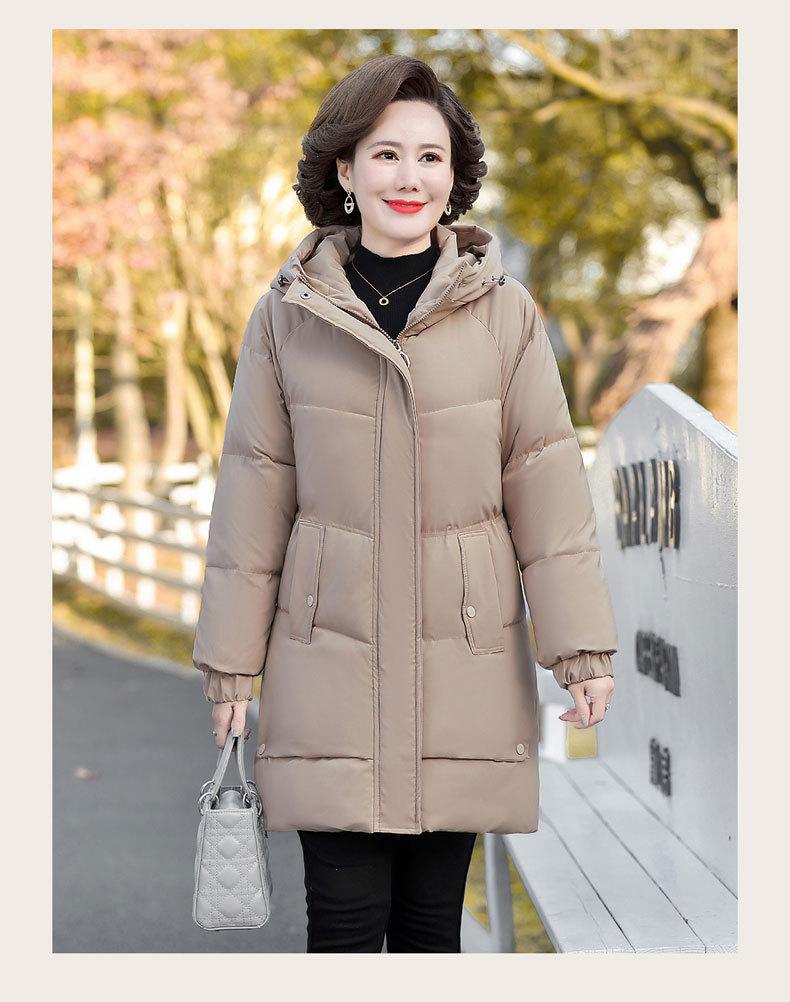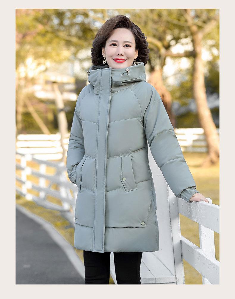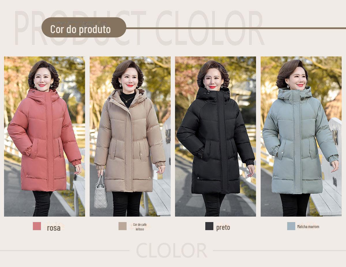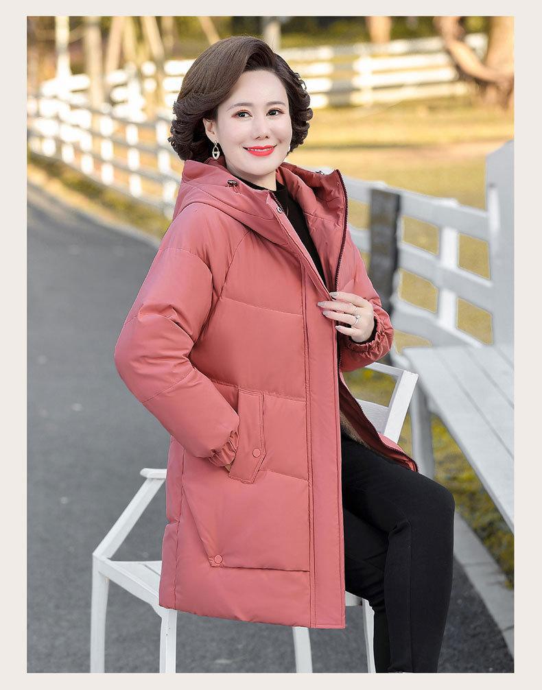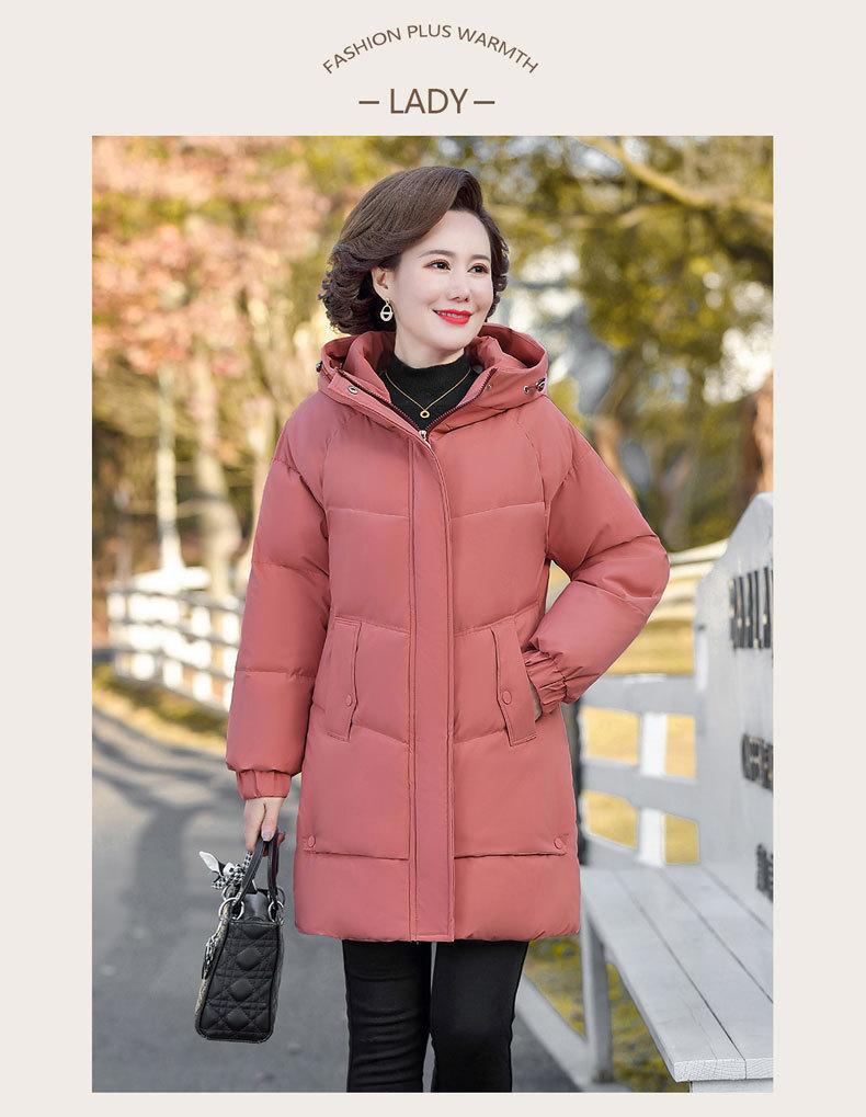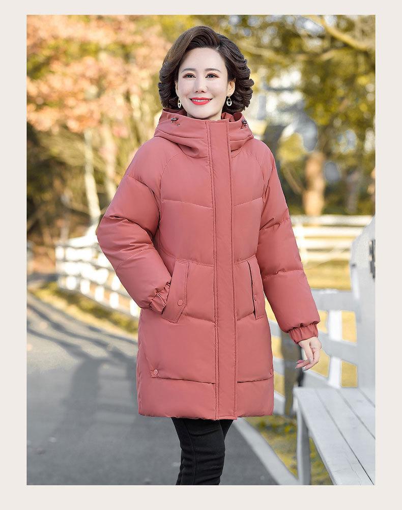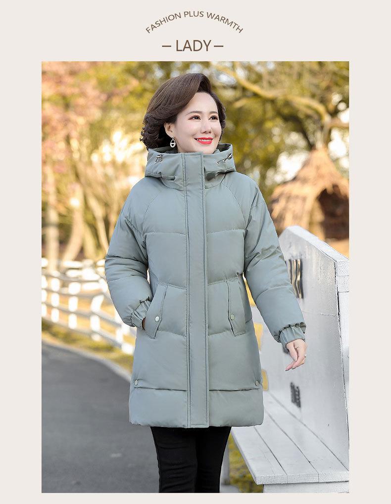Casaco de inverno acolchoado de algodão para mãe, casaco com capuz espesso e forrado de lã de comprimento médio, casaco de inverno acolchoado de algodão para mulheres de meia-idade e idosas