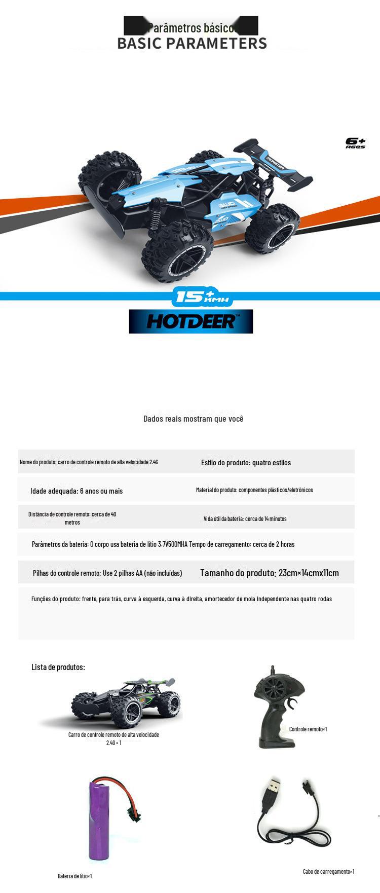 Carro de controle remoto de alta velocidade, 2,4 G, velocidade 14 KM / H Absorção de choque independente nas quatro rodas, pacote para frente e para trás 3,7 V, bateria de 700 mAh, tempo de uso: 12-15 minutos, cabo de carregamento USB * 1 (incluído) carregamento tempo 2-3 horas bateria de controle remoto 2AA (não incluída) distância de controle remoto: 50-70 metros