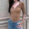 Liquidación Especial Mono Amarillo-Marrón con Escote en V Profundo, Ajustado, Top de Manga Larga que Ciñe la Cintura para Chicas Hot, No Retornable