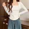 Camiseta Feminina Estilo Coreano com Decote Quadrado, Manga Longa e Cintura Franzida, Novo Top Curto Outono 2026 para Meninas Petite Picantes