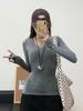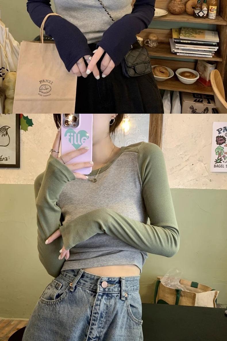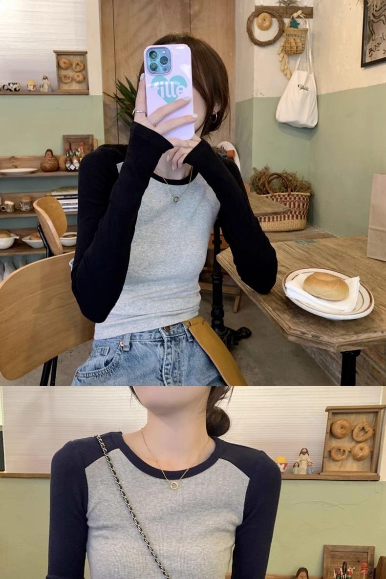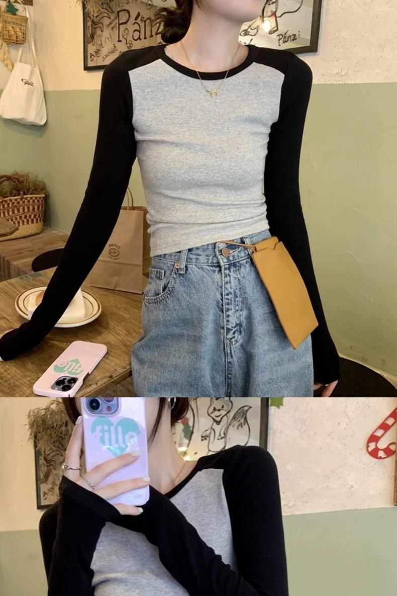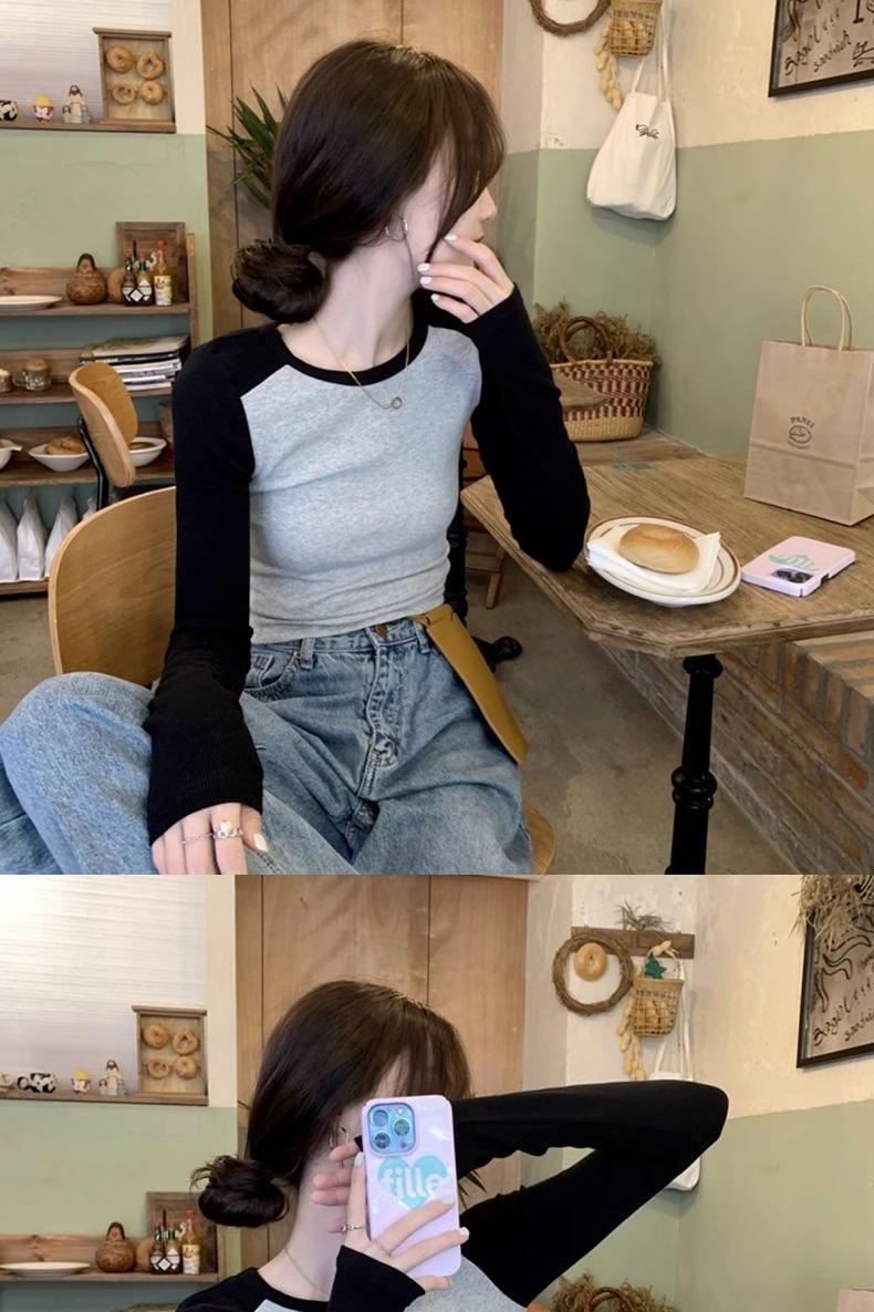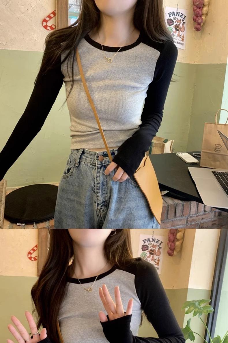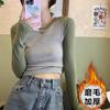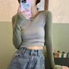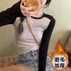 Estilo americano ombro retrô manga comprida camiseta feminina outono e inverno camisa de fundo interior hot girl slim-fit short top design sense