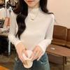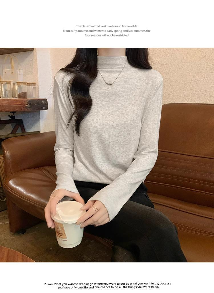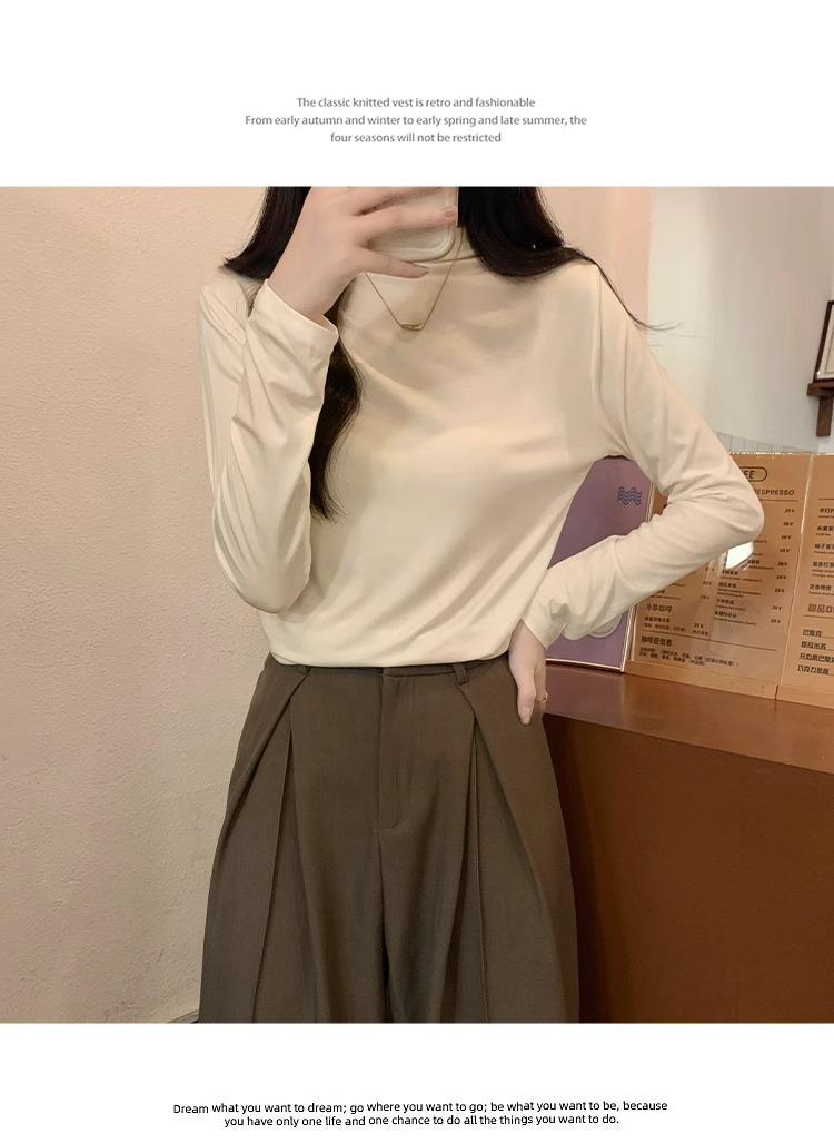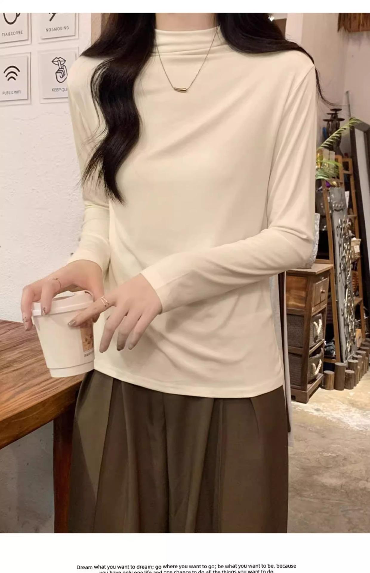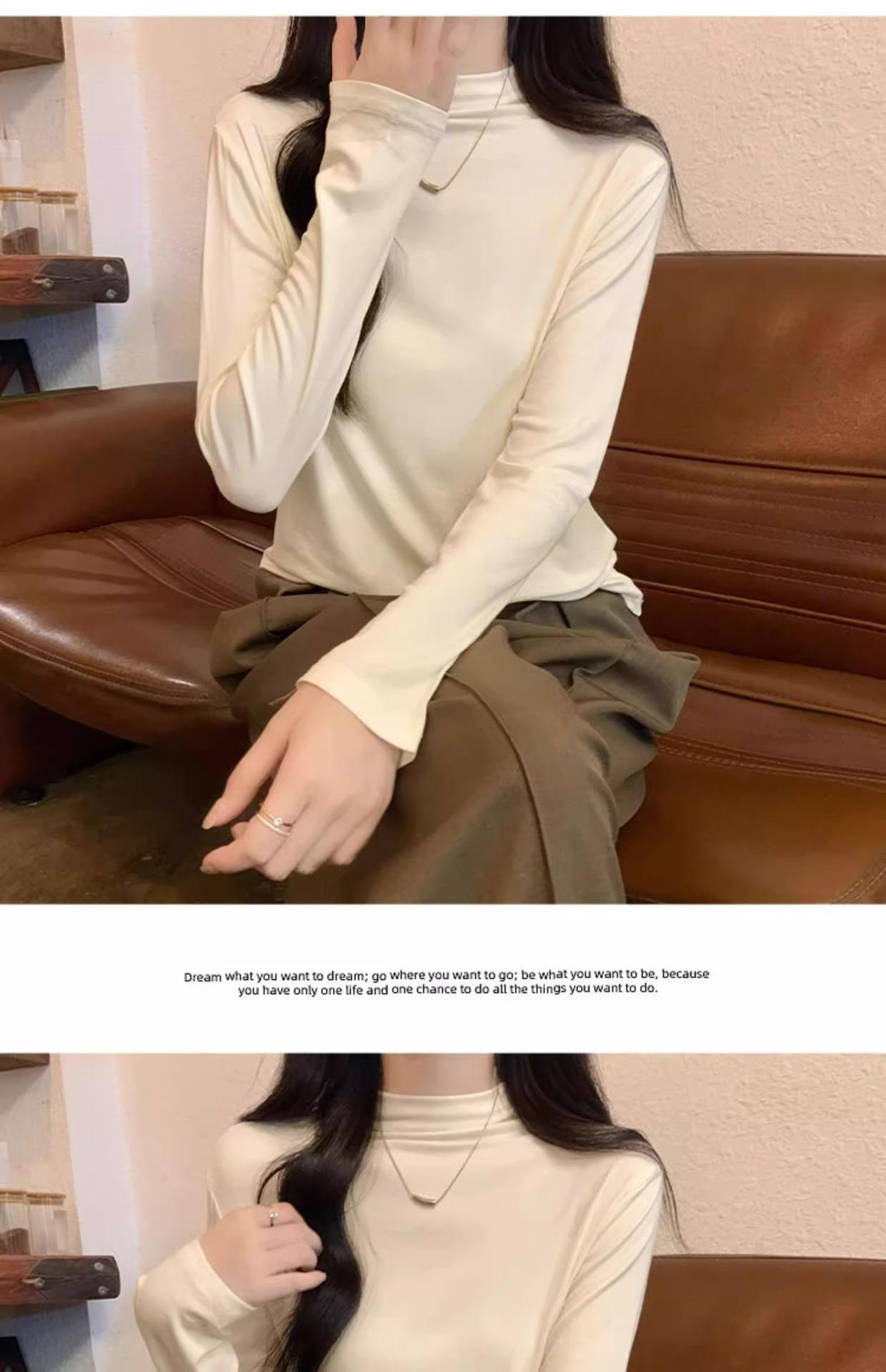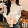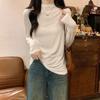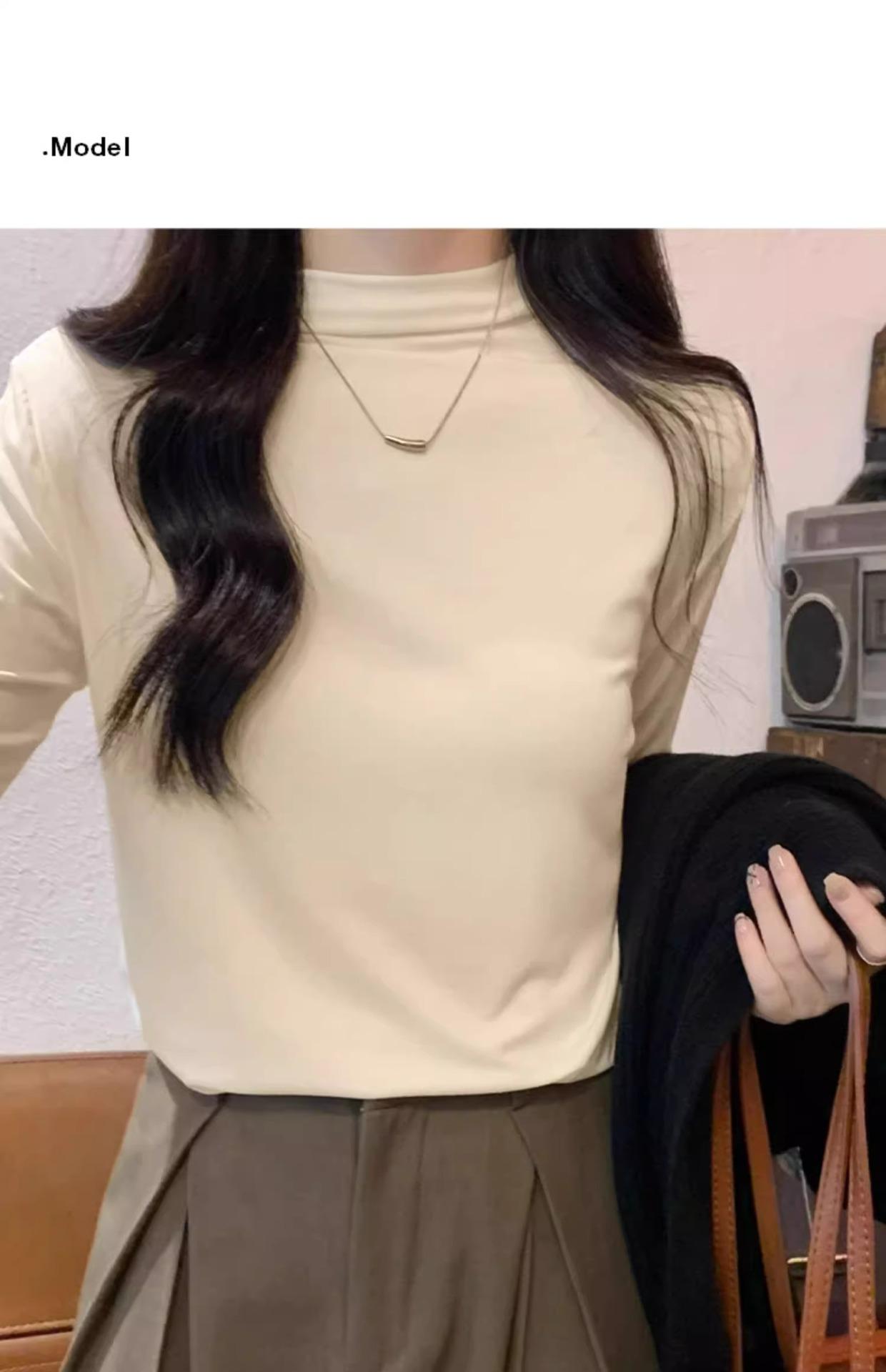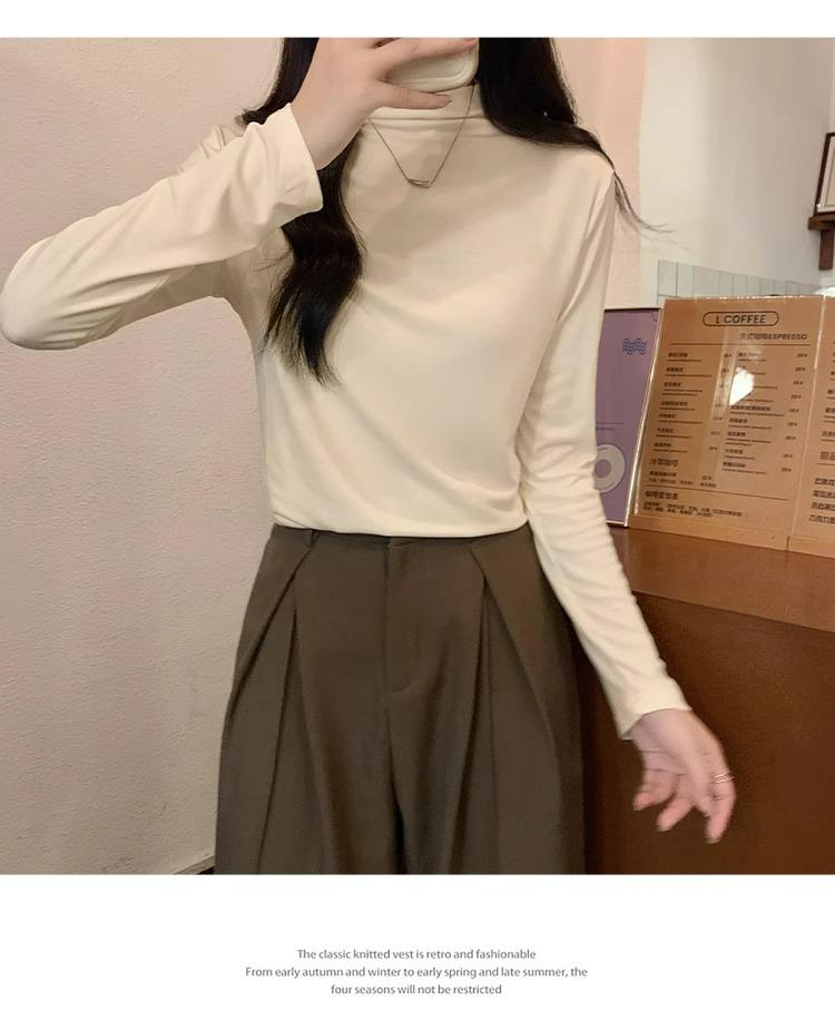 Camiseta de Gola Alta Francesa Forrada com Lã Espessa para Outono e Inverno Aparência Slim de Manga Longa Top Interno