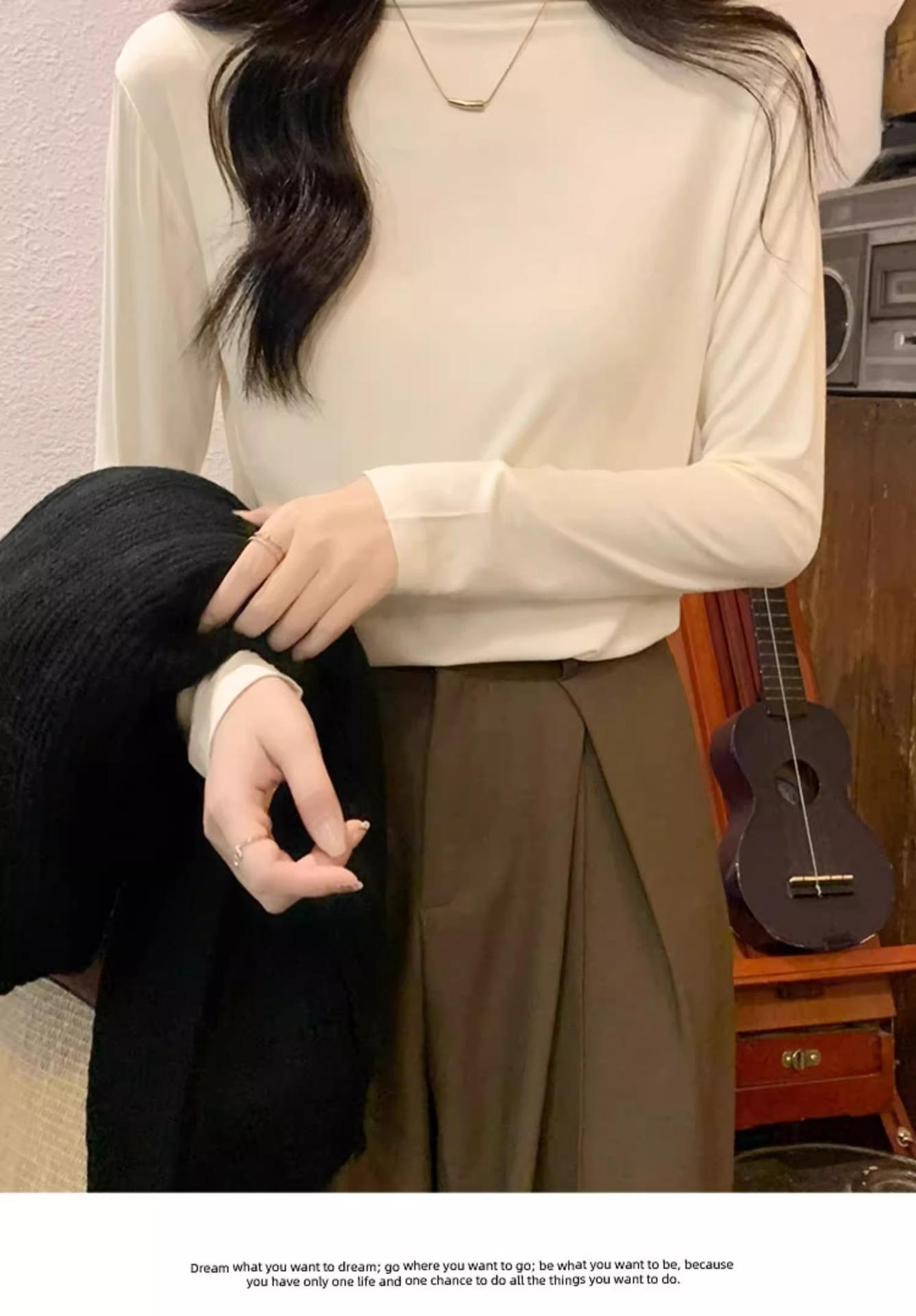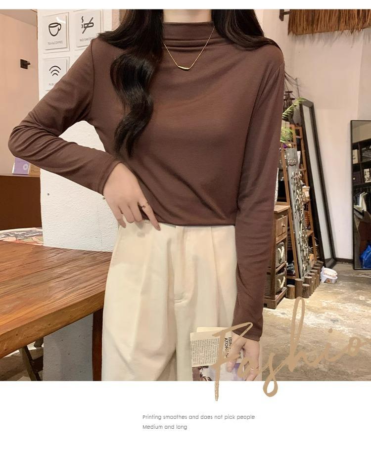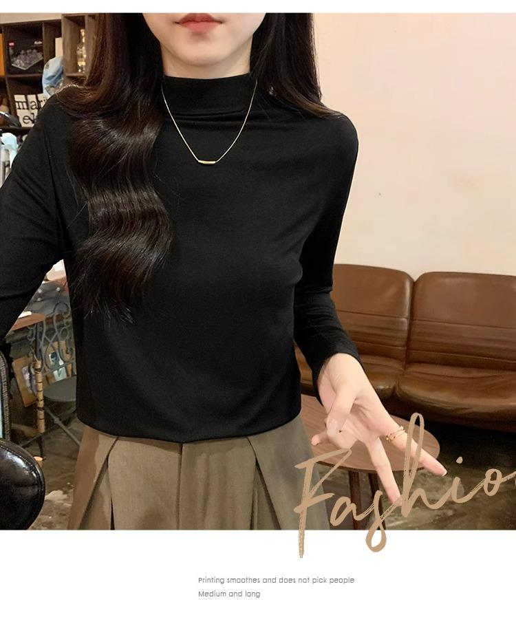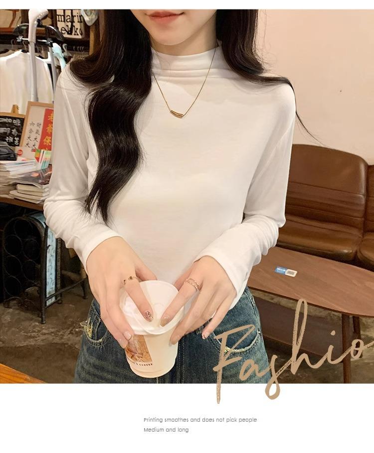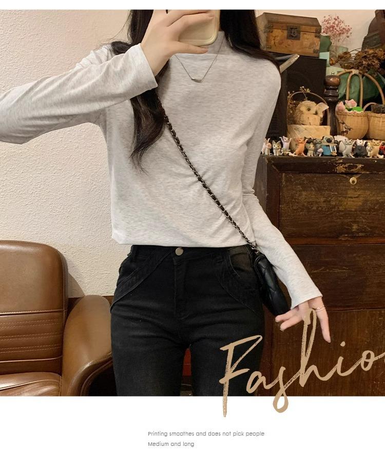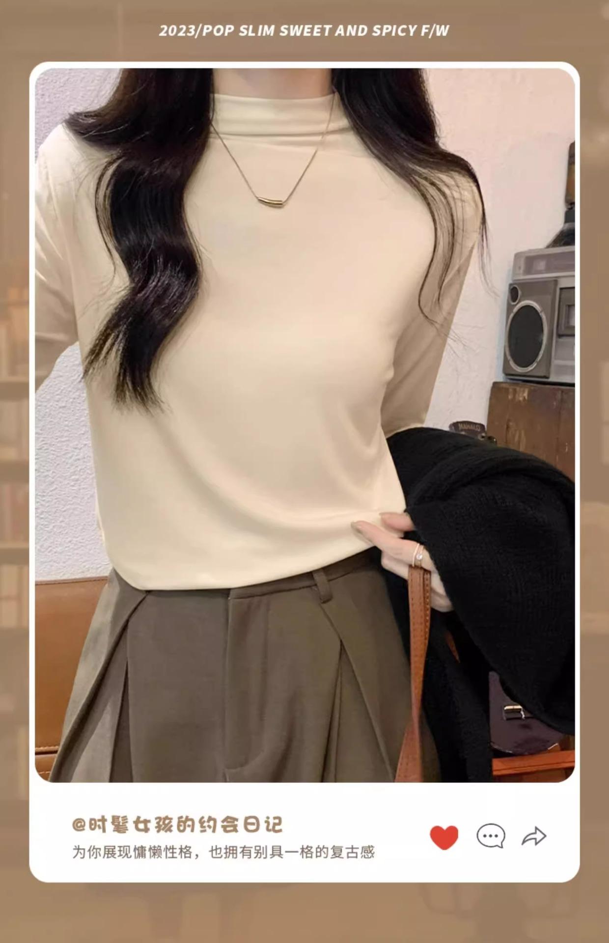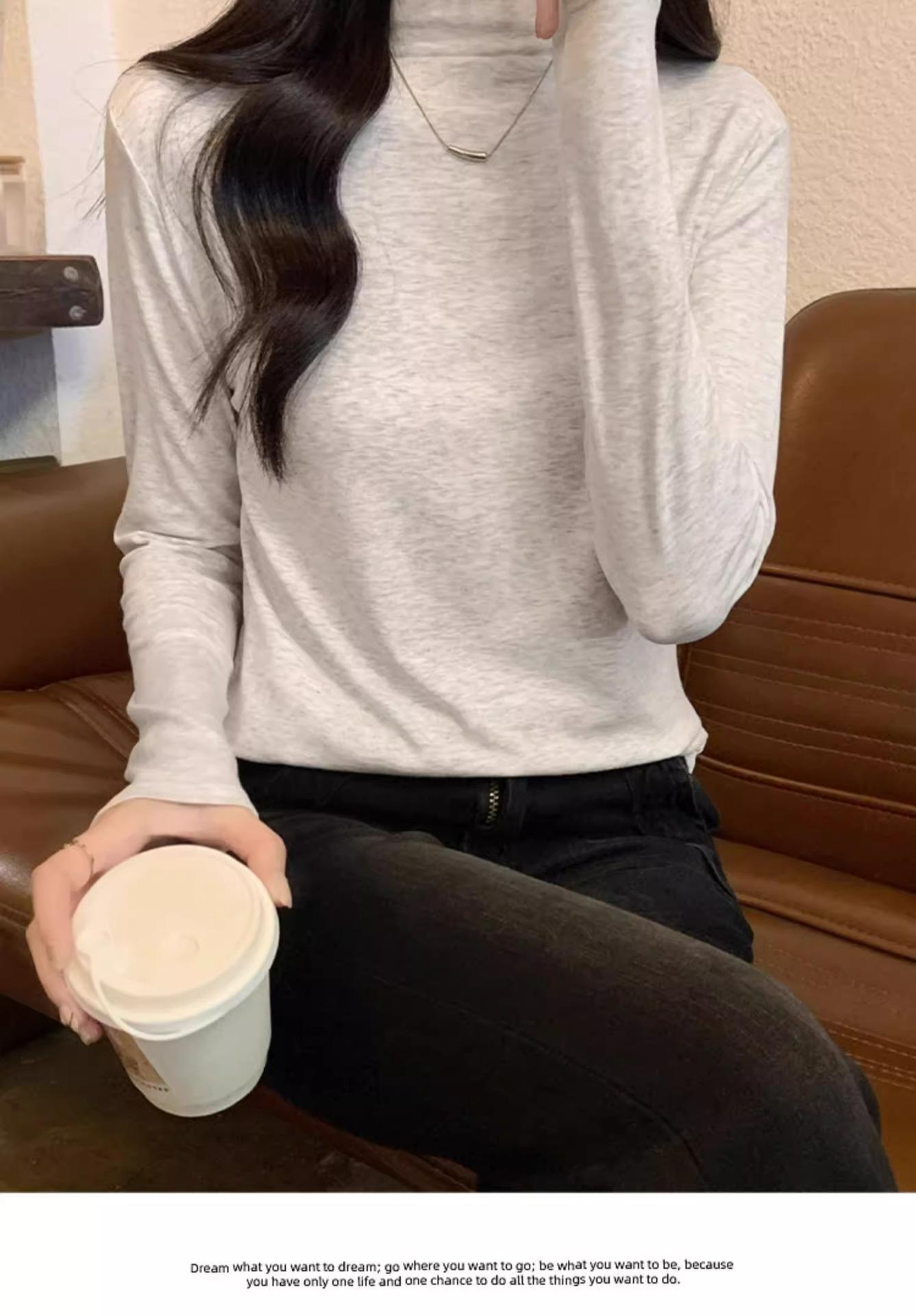 Camiseta de Gola Alta Francesa Forrada com Lã Espessa para Outono e Inverno Aparência Slim de Manga Longa Top Interno