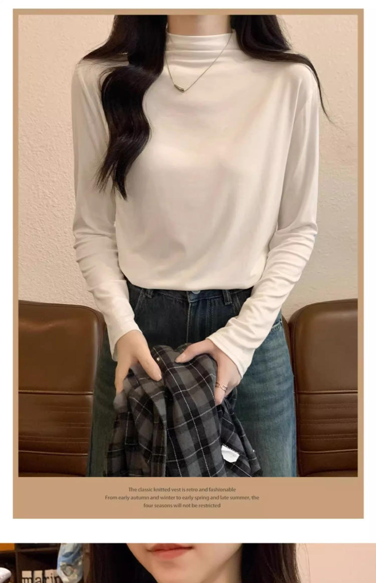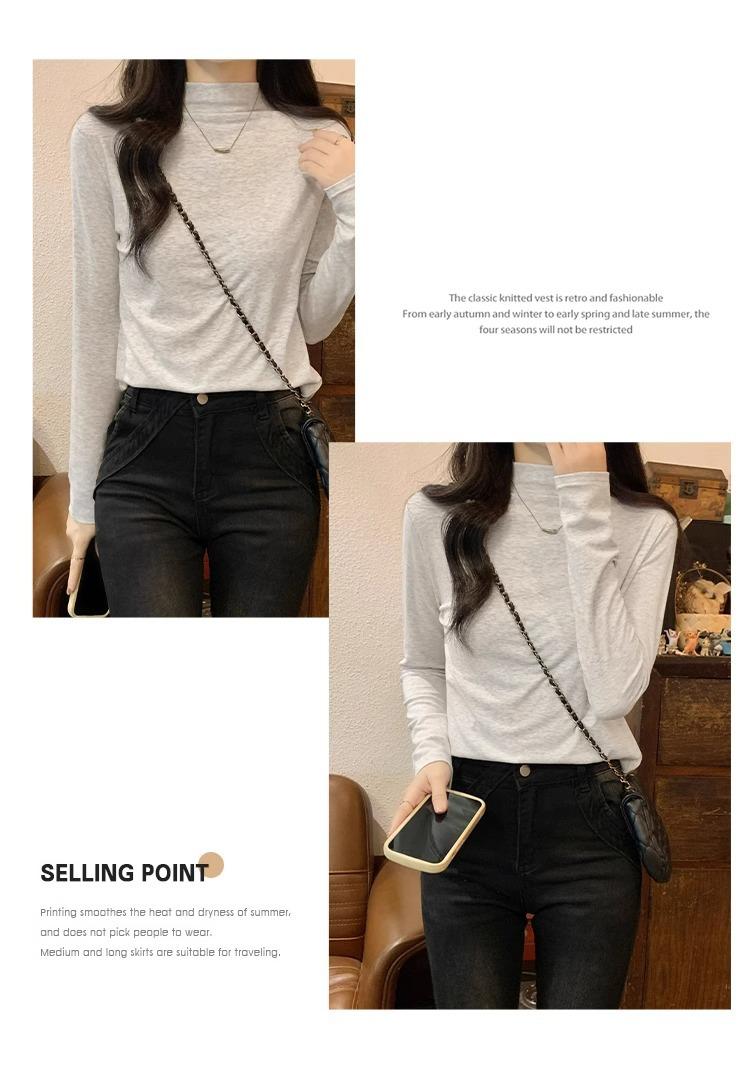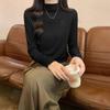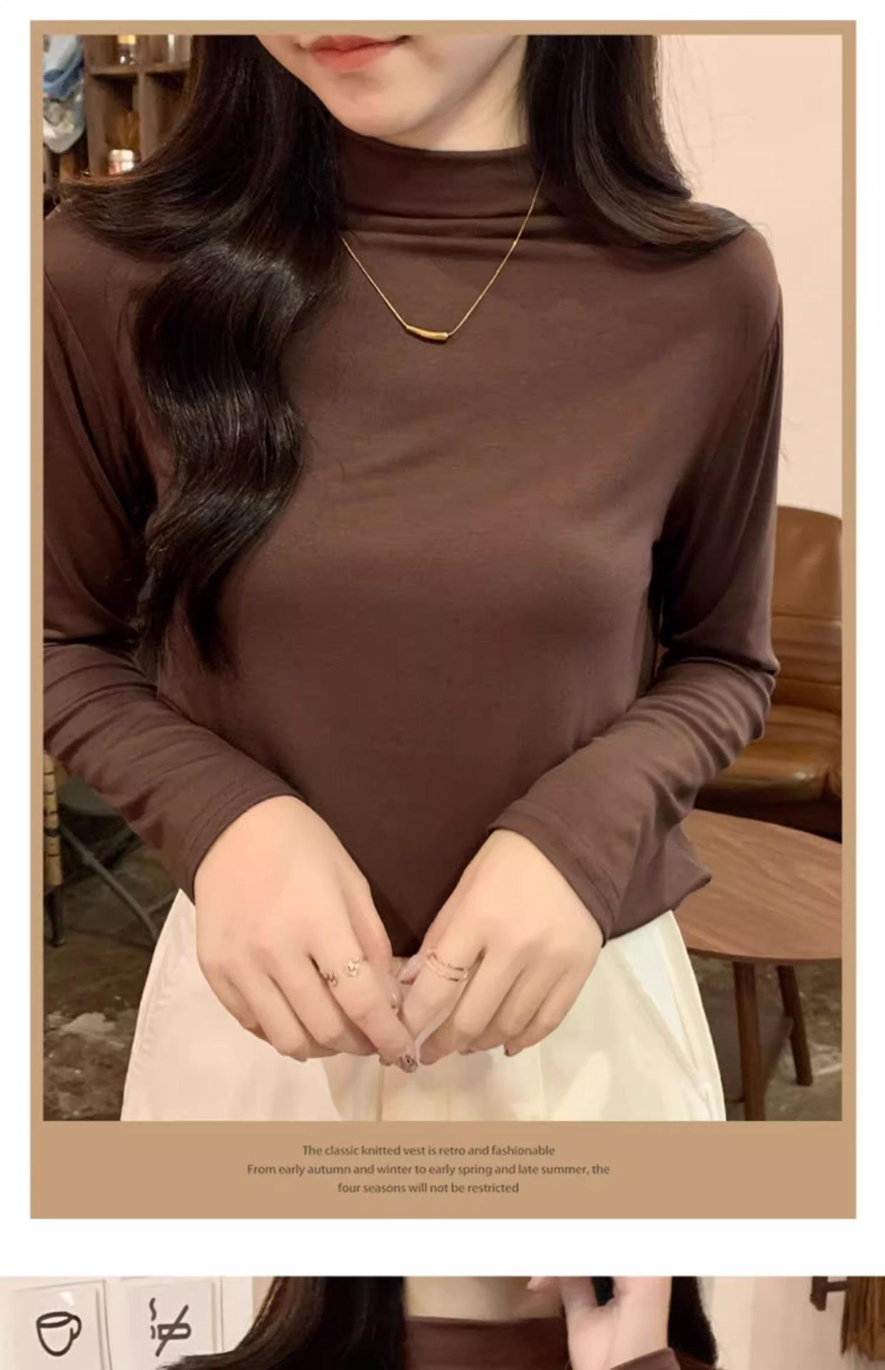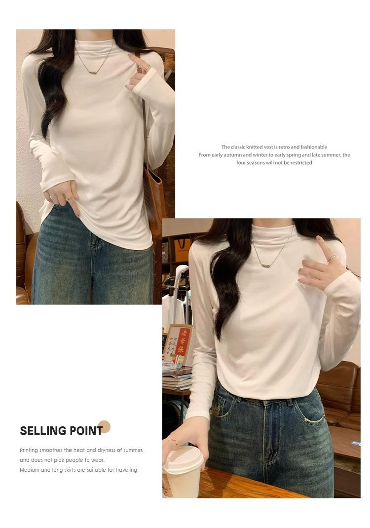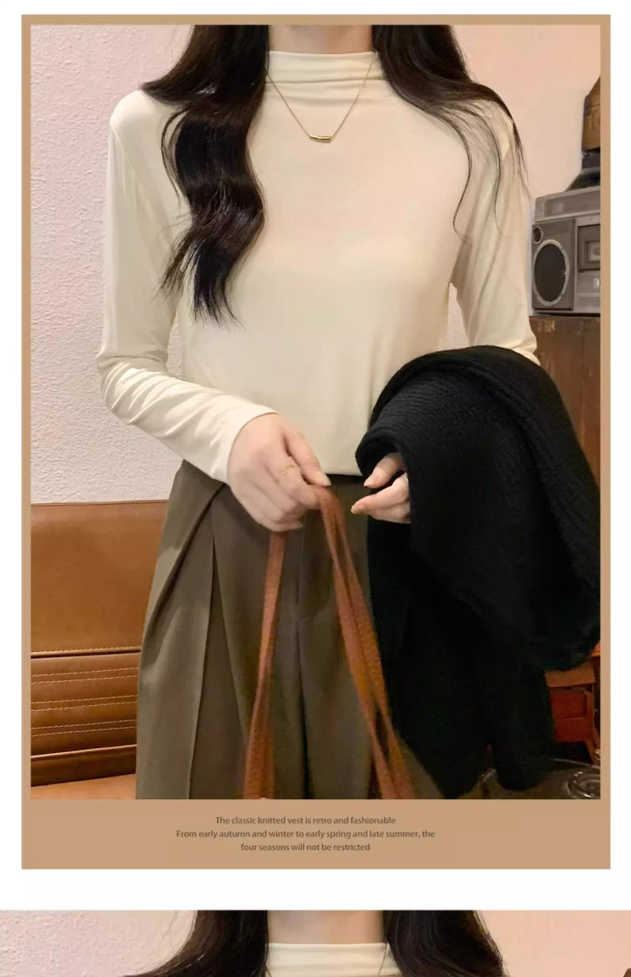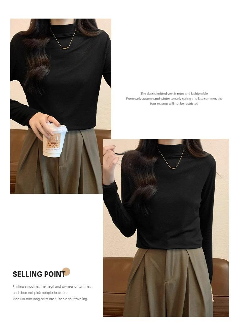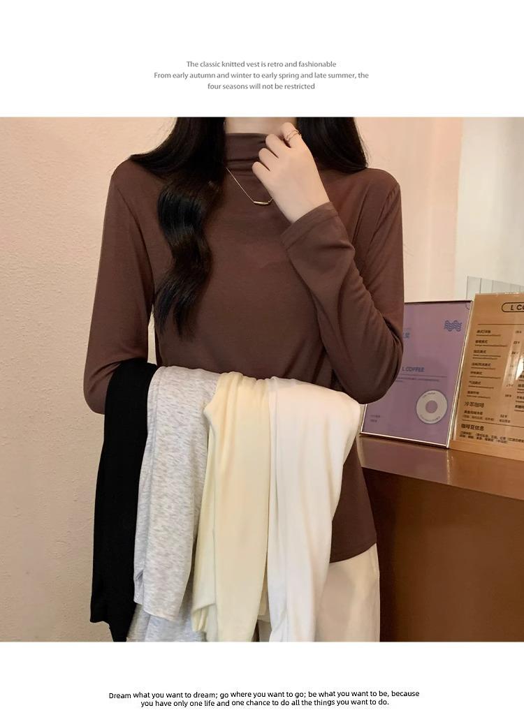 Camiseta de Gola Alta Francesa Forrada com Lã Espessa para Outono e Inverno Aparência Slim de Manga Longa Top Interno
