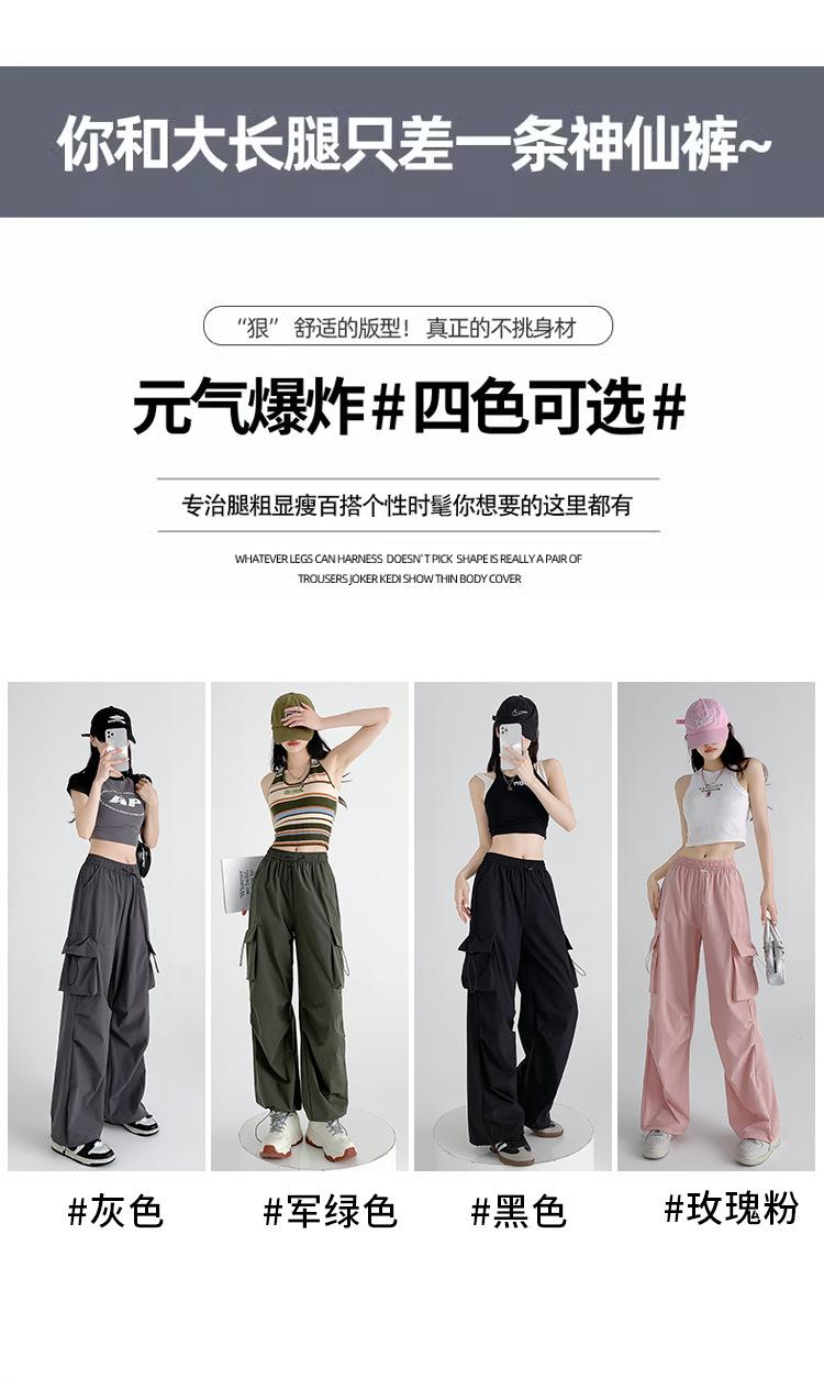 Calças Cargo de Nylon para Mulheres Verão Fino Americano Reto Calças Paraquedas Cintura Alta Casual Perna Larga Secagem Rápida Esportivas