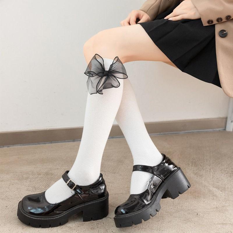 Meias de comprimento médio da panturrilha do laço para as mulheres Primavera e Outono preto e branco JK Lolita meias de panturrilha japonesa menina preppy estilo meias de joelho