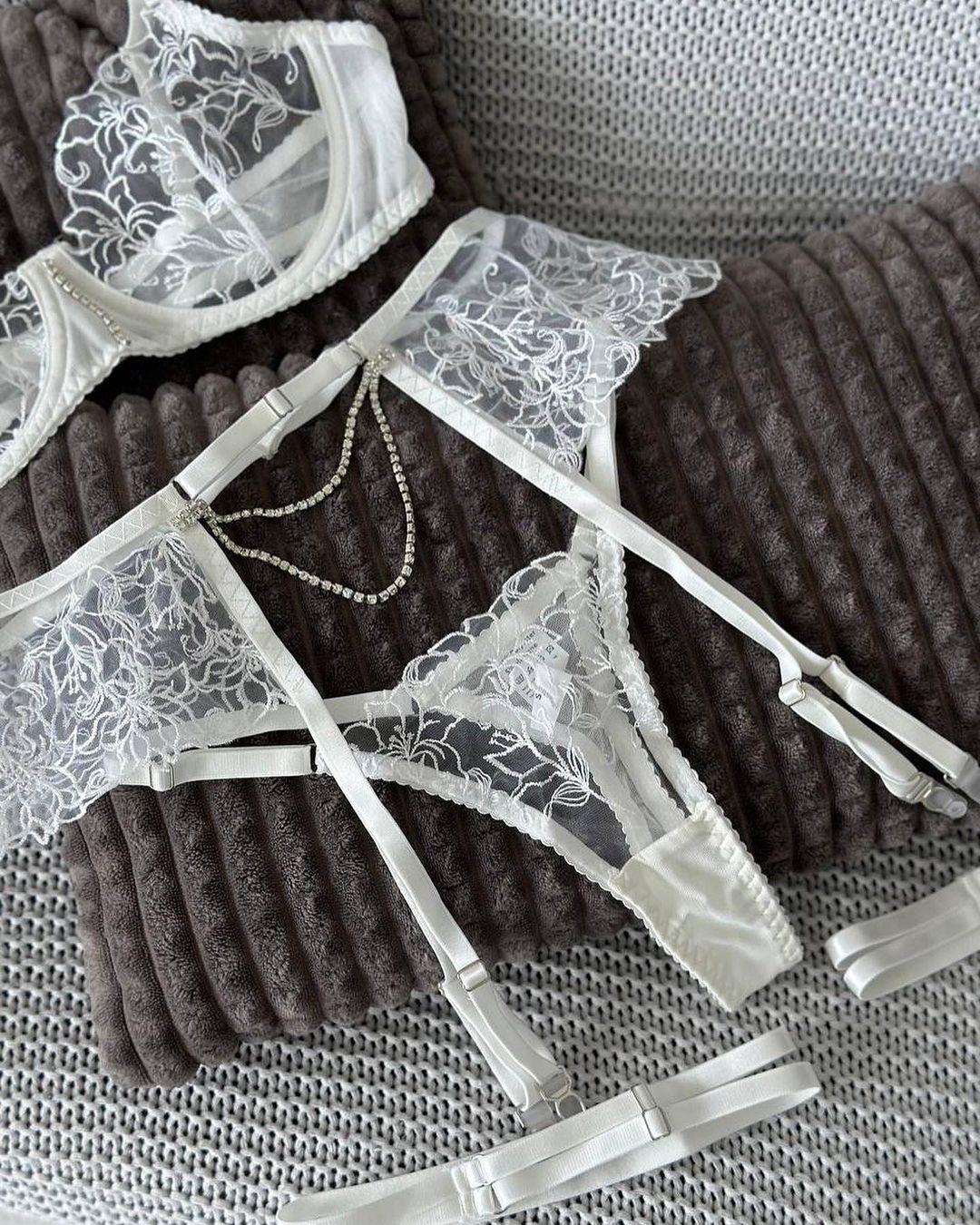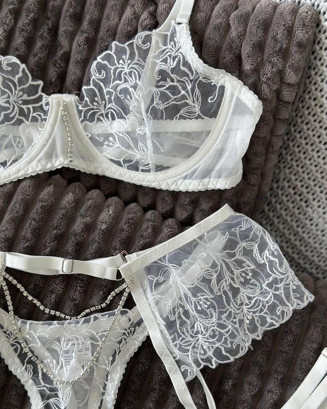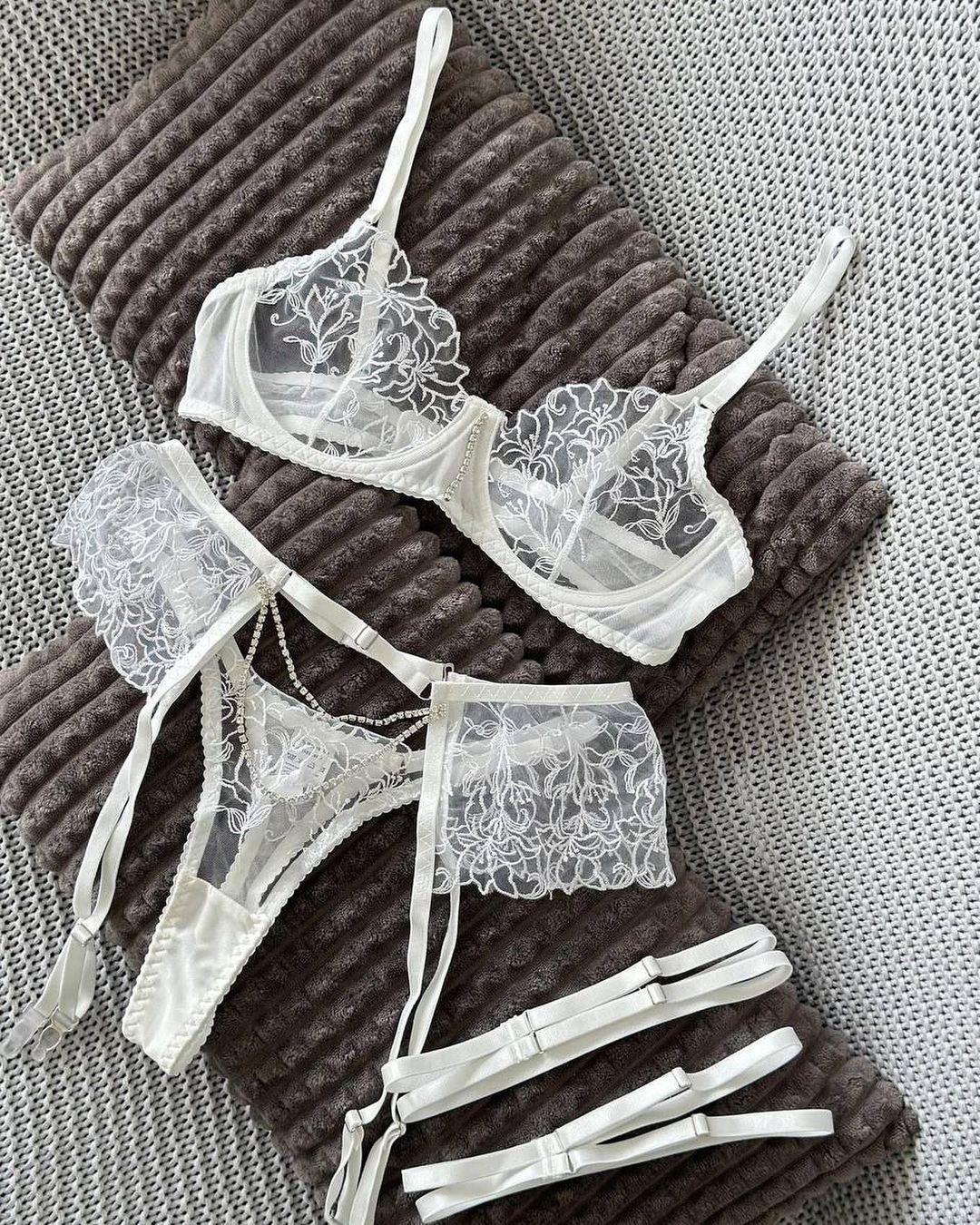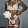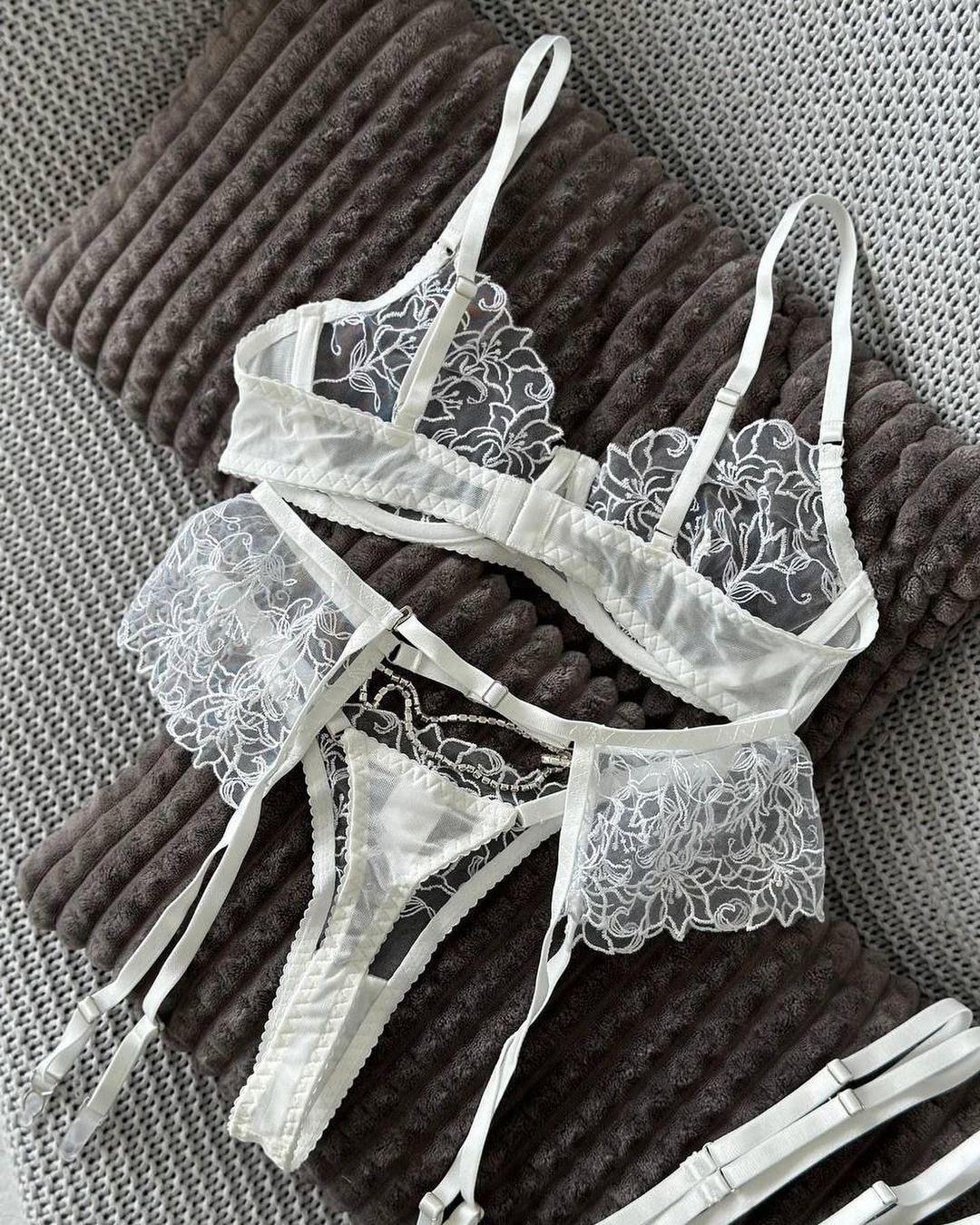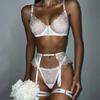 Uniforme de lingerie sexy transfronteiriço europeu e americano Pure Desire, conjunto de várias peças sexy com corrente de metal e bordado de flores transparentes