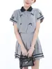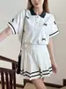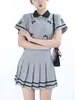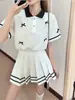 Colégio malha terno moda feminina verão contraste cor tridimensional laço manga curta camiseta cintura alta saia plissada conjunto de duas peças