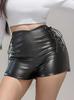 Shorts femininos de couro PU com cadarço vazado, personalidade, preto, cintura alta, elástico, calças casuais justas, estilo europeu e americano, calças de couro, moda feminina
