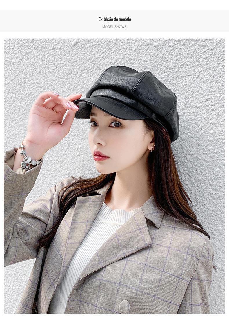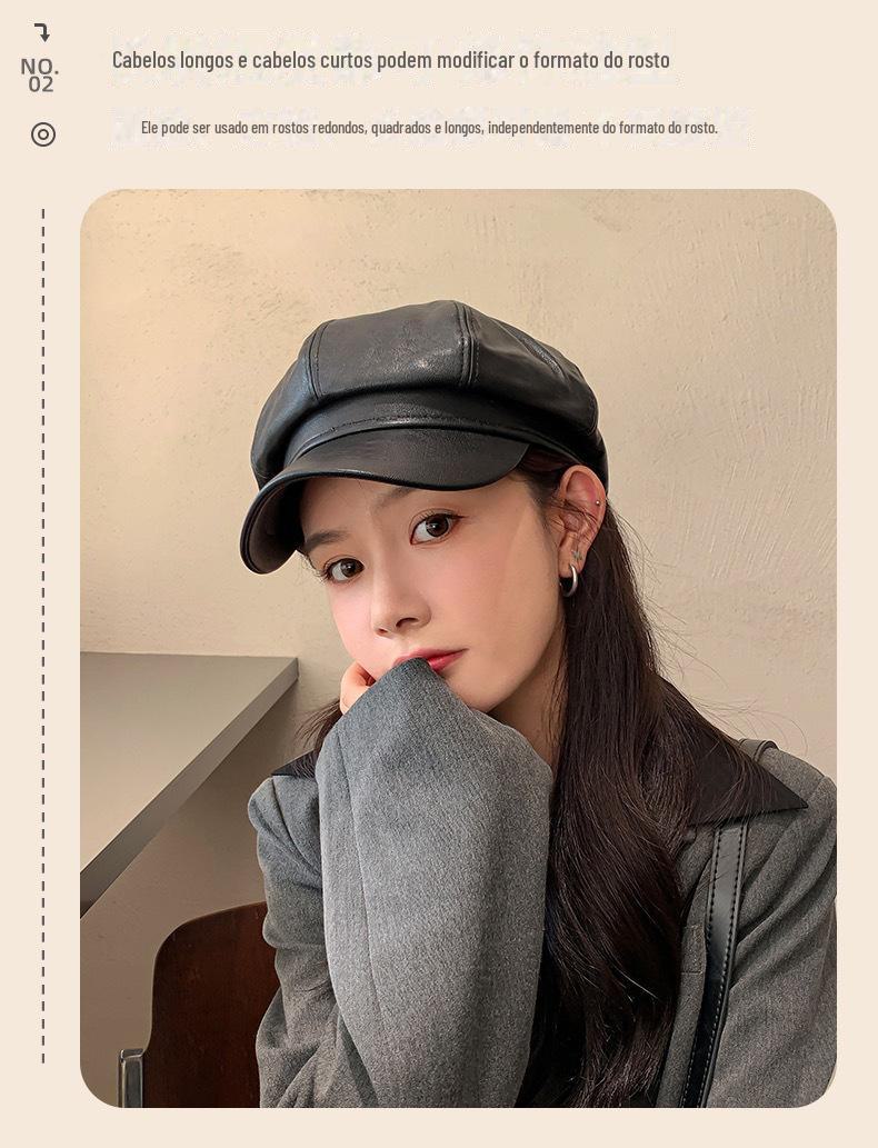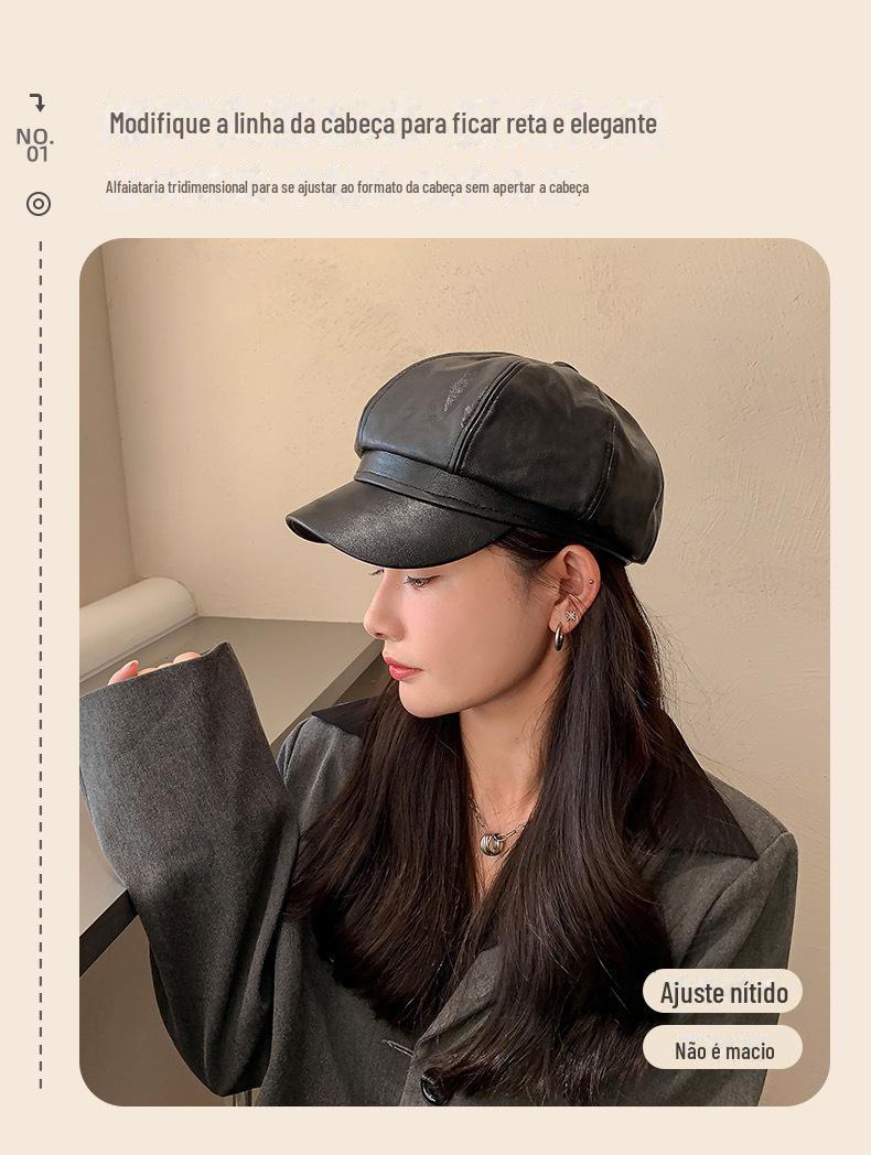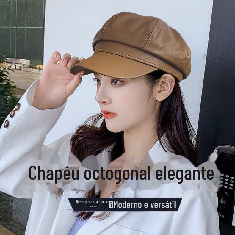 Chapéu Feminino Estilo Coreano Chapéu Octogonal Mostrando o Rosto Pequeno Couro PU Boné com Aba Primavera Britânico Moderno Chapéu de Pintor Boina