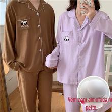 Panda casal pijamas primavera e verão novo tencel legal algodão masculino gola aberta feminino com almofada no peito cor sólida roupas de casa