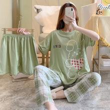 Verão novo pijama de seda de leite feminino carta grade terno shorts de manga curta e calças compridas terno de três peças dos desenhos animados roupas de casa