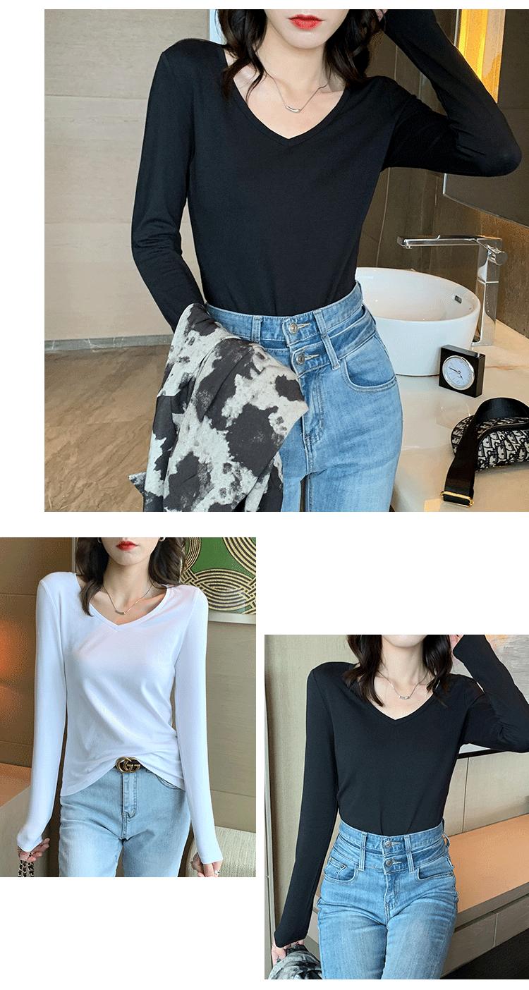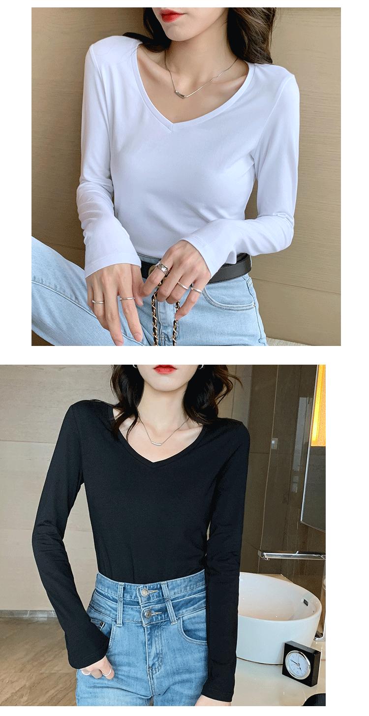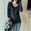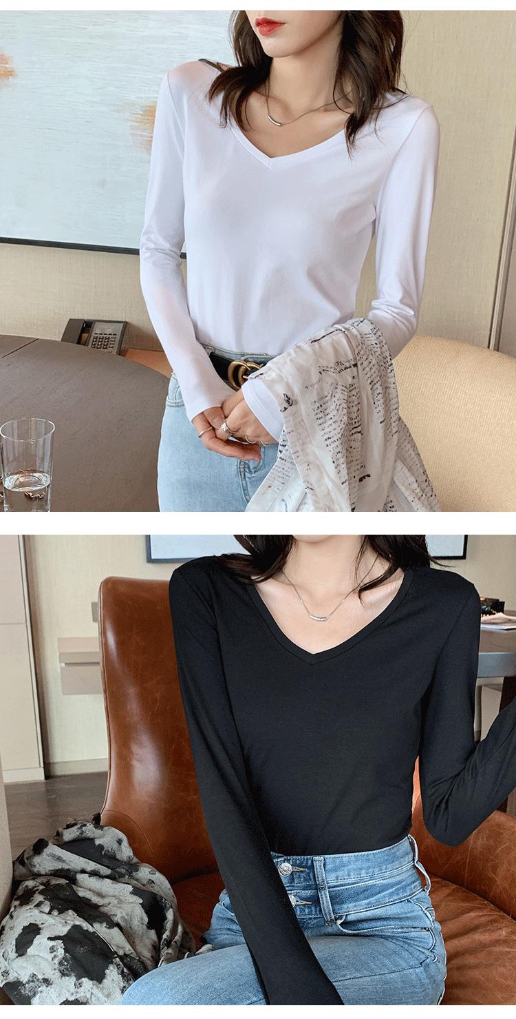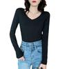 Camiseta Básica Slim de Algodão Puro Estilo Coreano para Atacado Feminina Manga Longa Justa Decote V 2025 Nova Primavera & Outono Roupa Íntima