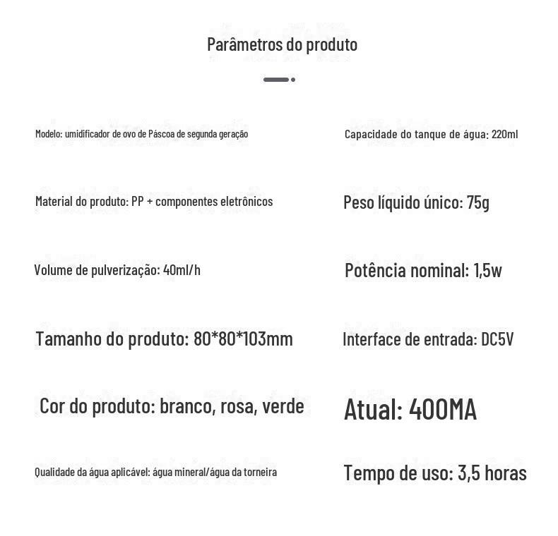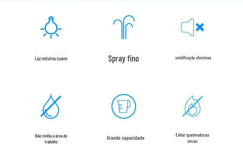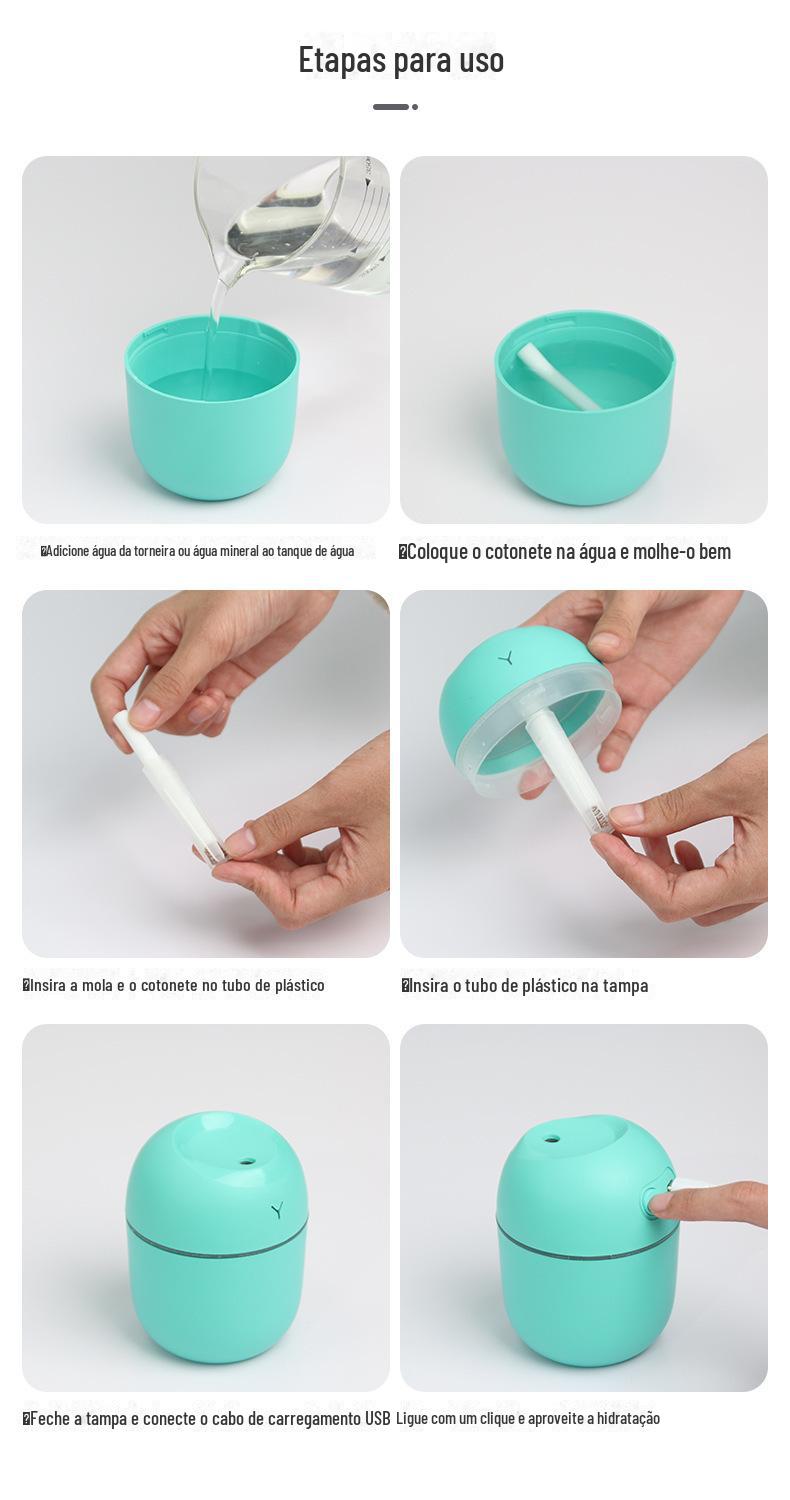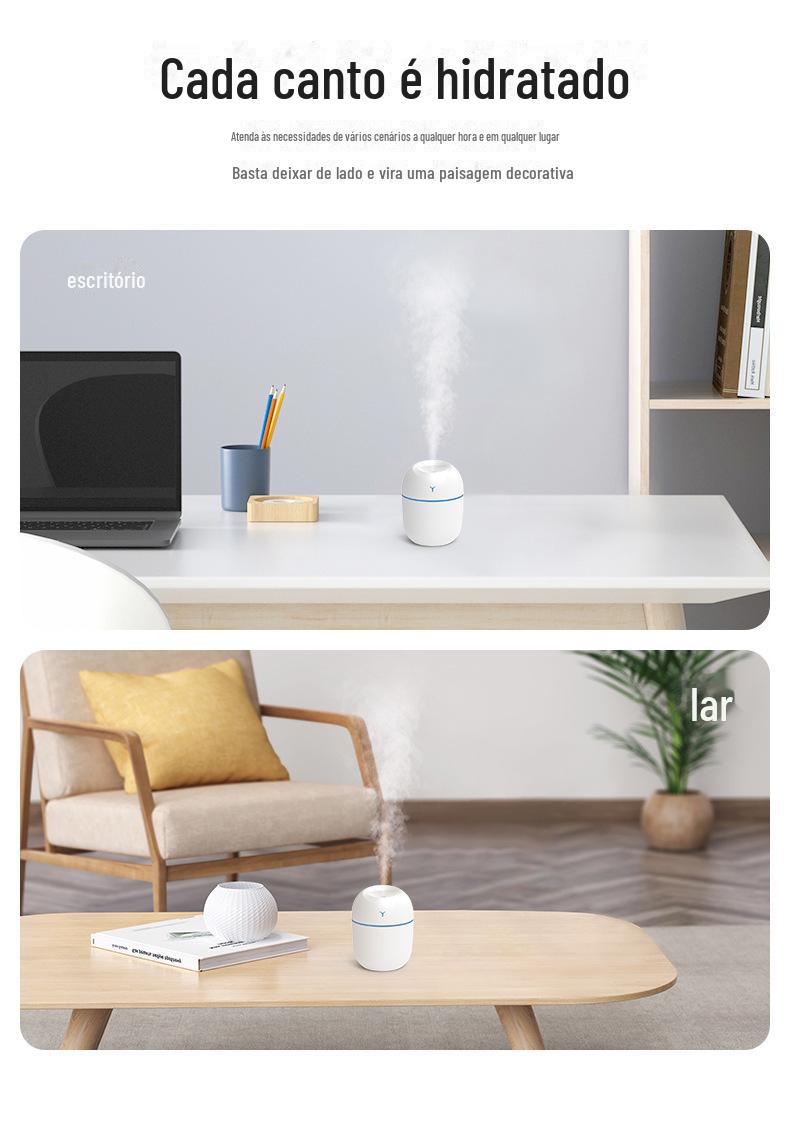 Configuração padrão do produto: Umidificador, Cabo de carregamento USB, Manual de instruções, Embalagem em caixa colorida