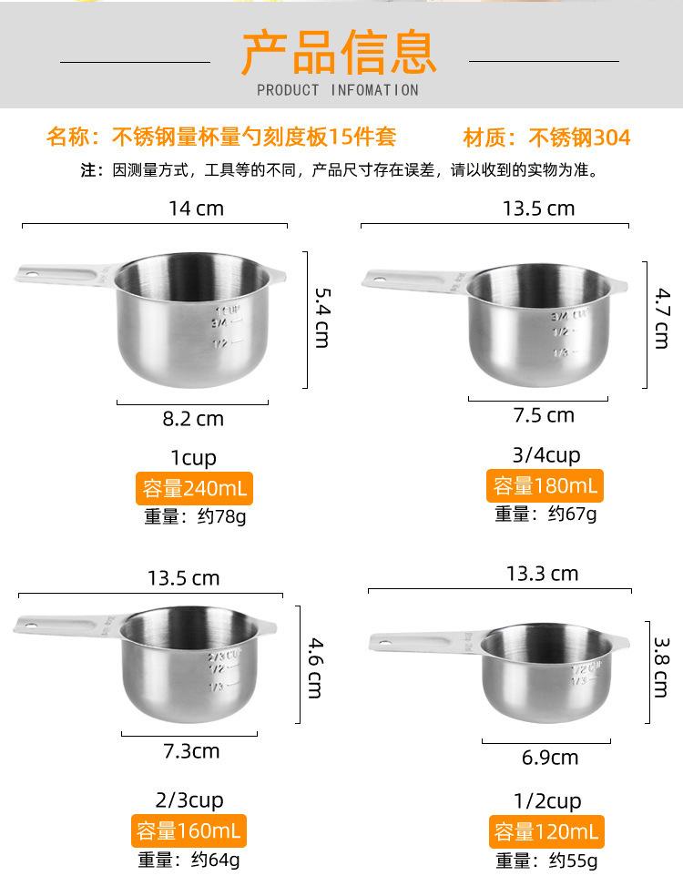 304 aço inoxidável copo medidor colher de medição utensílios de panificação medição gramas colher colher de tempero copo de vinho jogo de 14 peças