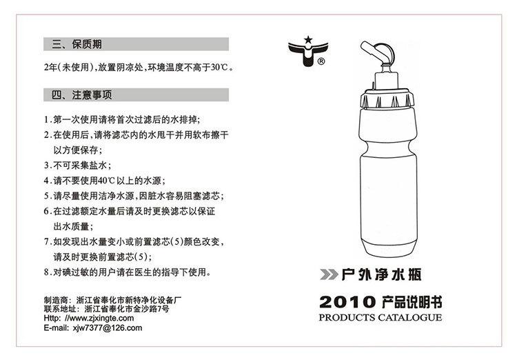 Precauções:1.Por favor, cuspa o primeiro gole de água. 2.Filtre a água e evite coletar água salgada e água poluída quimicamente. 3.Não coloque no forno de micro-ondas. 4.Use água limpa tanto quanto possível, pois a água suja pode facilmente entupir o filtro e reduzir sua vida útil.