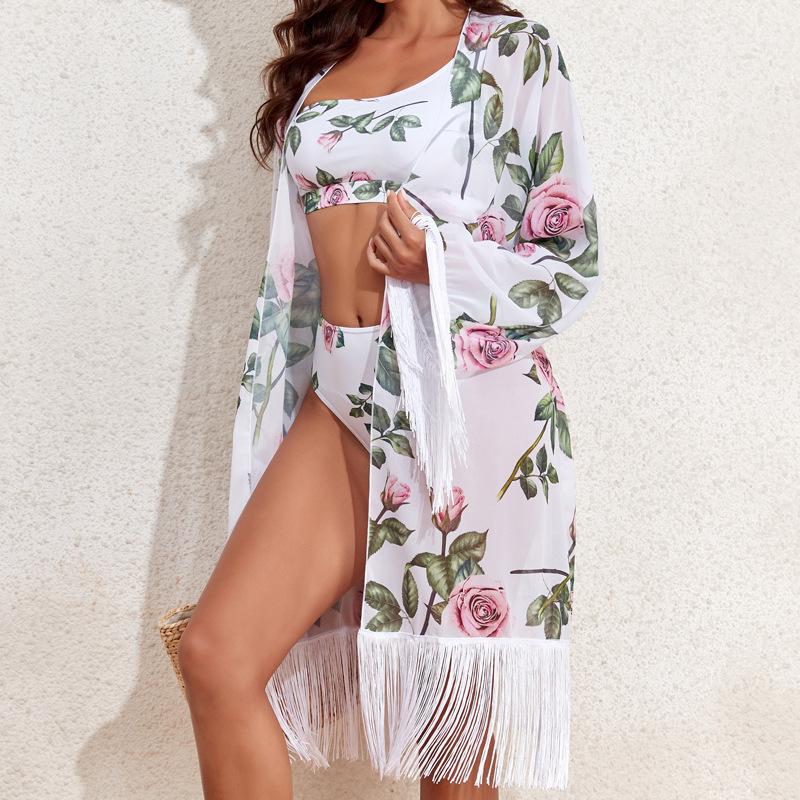 2024 novo maiô europeu e americano três peças cross-border blusa estampada proteção solar roupa malha moda emagrecimento biquíni