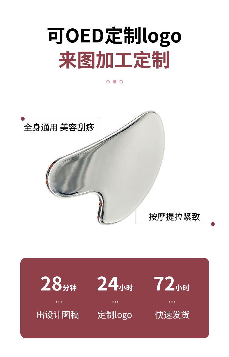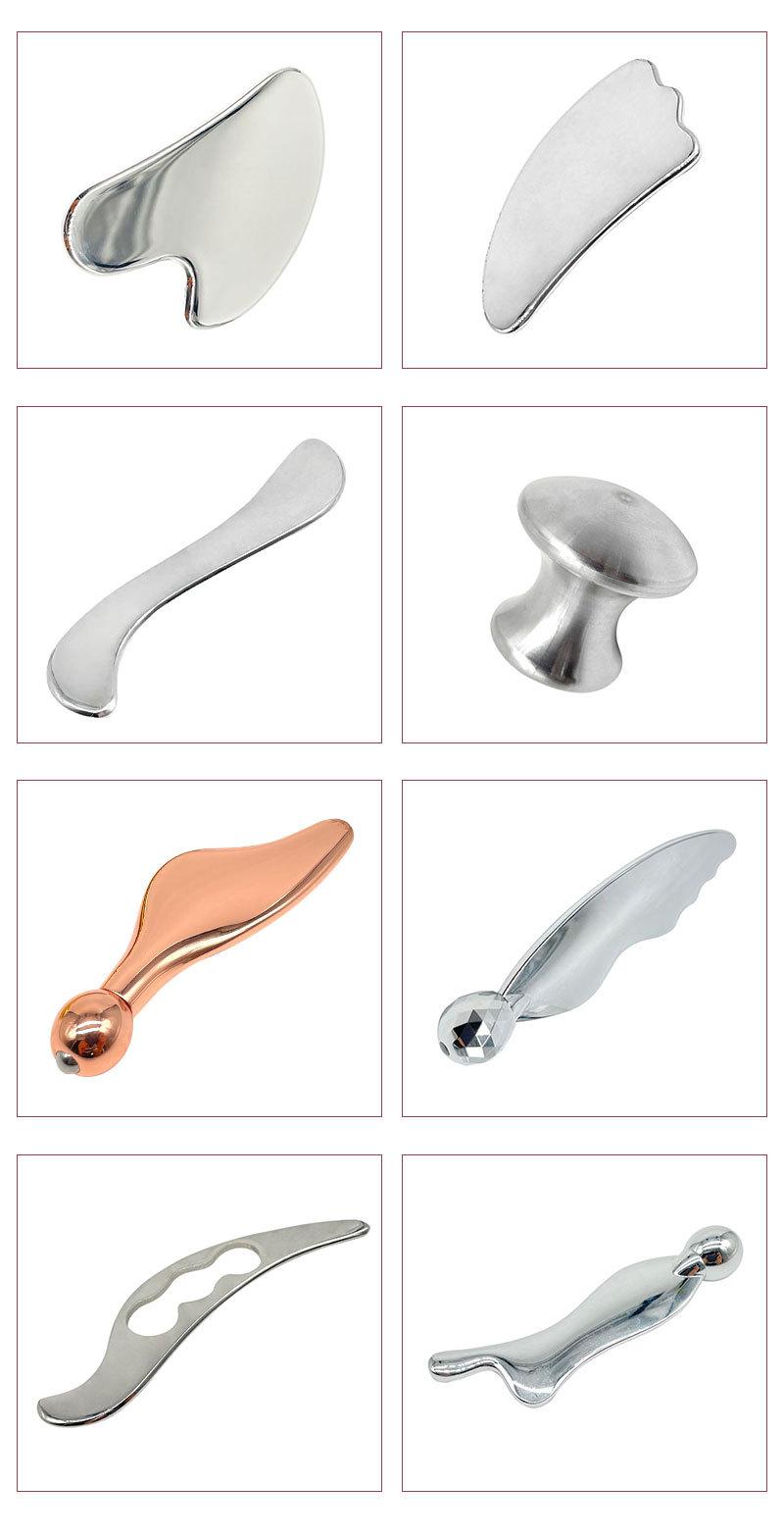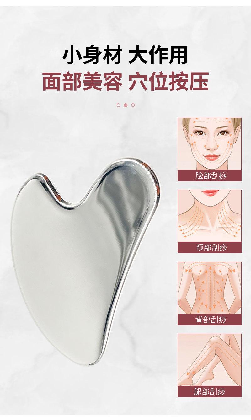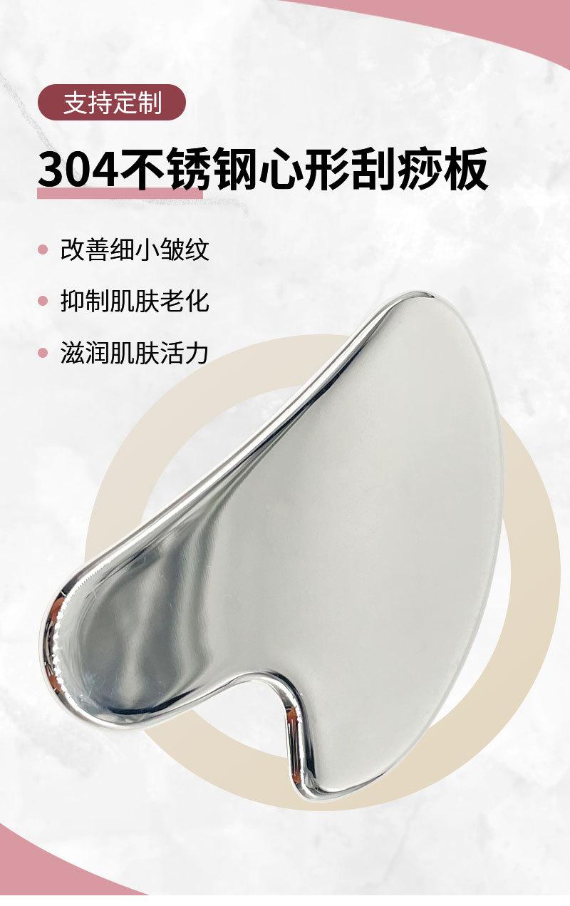 Fornecimento direto de tábua de raspar em formato de coração de aço inoxidável 304, tábua de raspar para massagem facial e corporal de prata, tábua de raspar em formato de coração pode ser impressa
