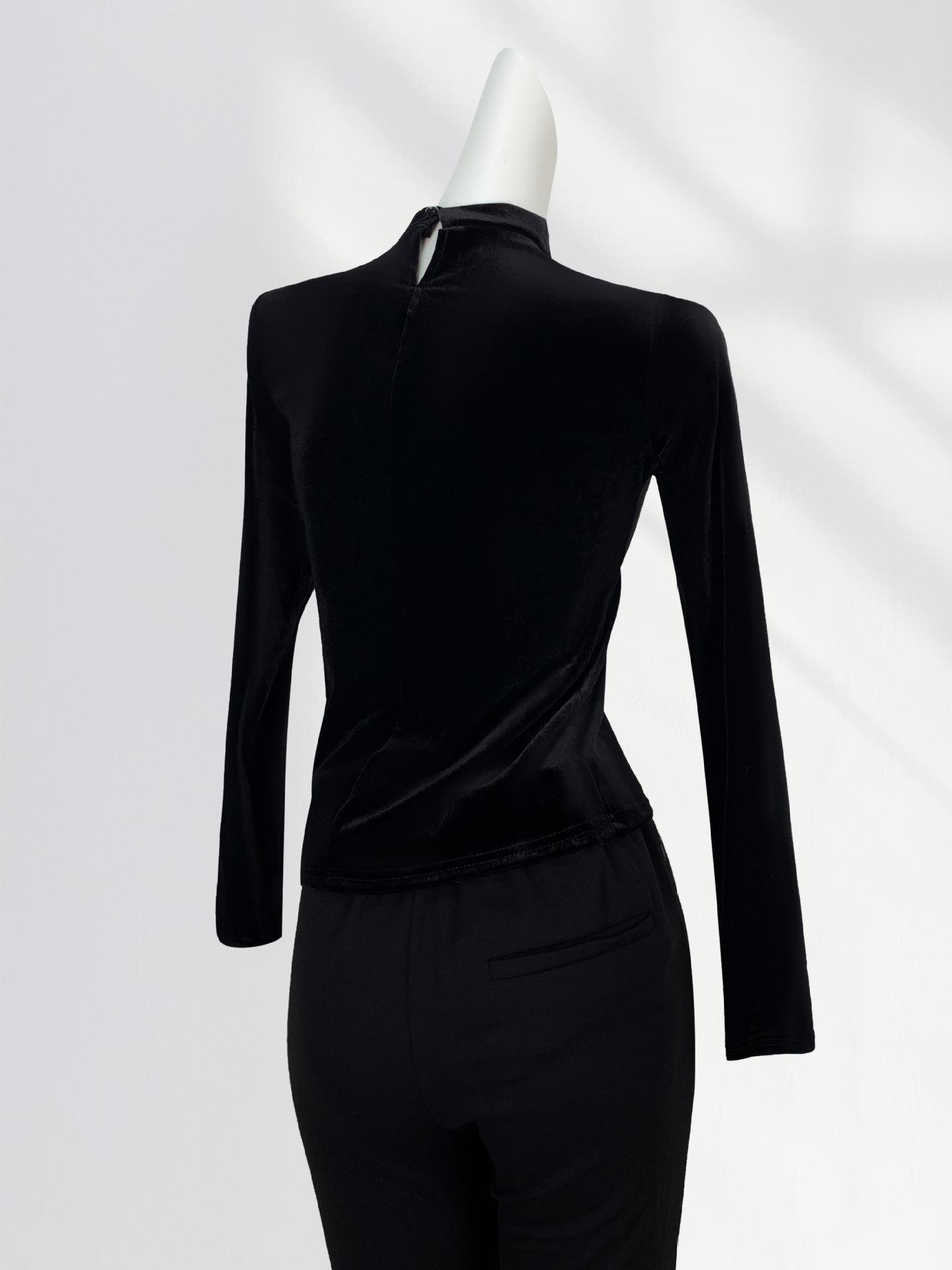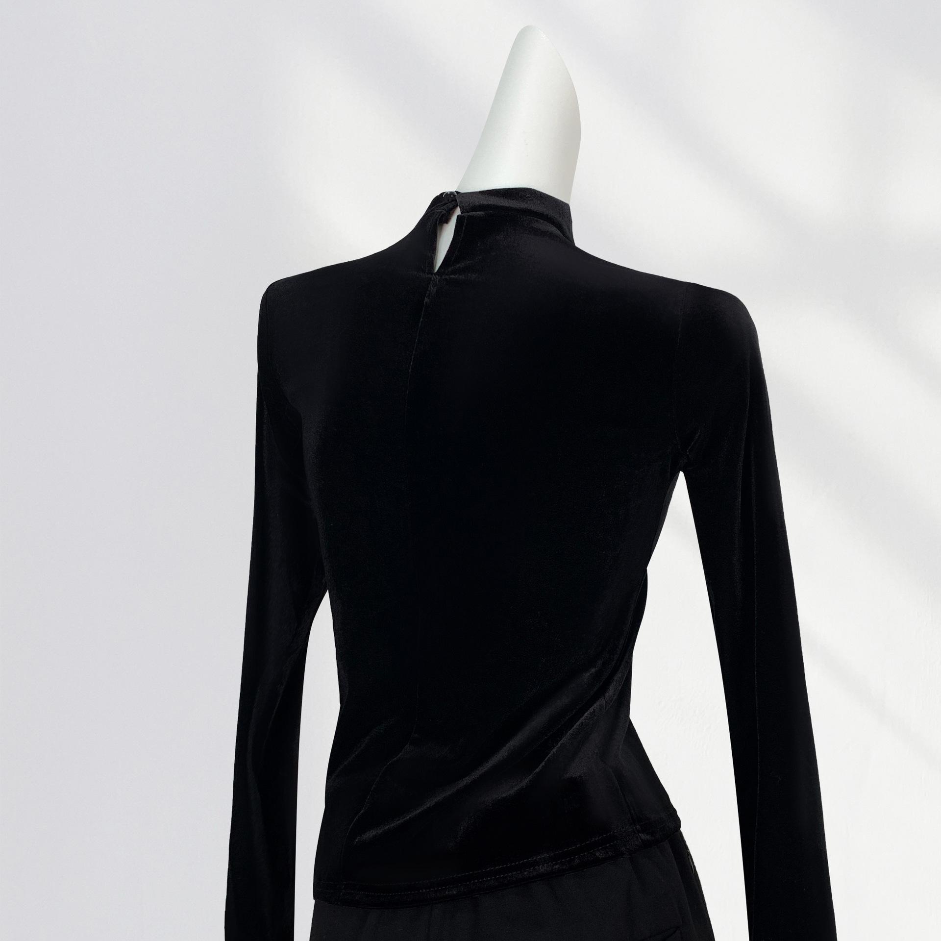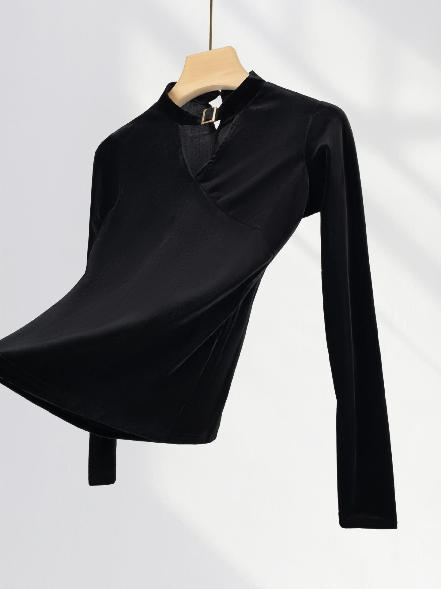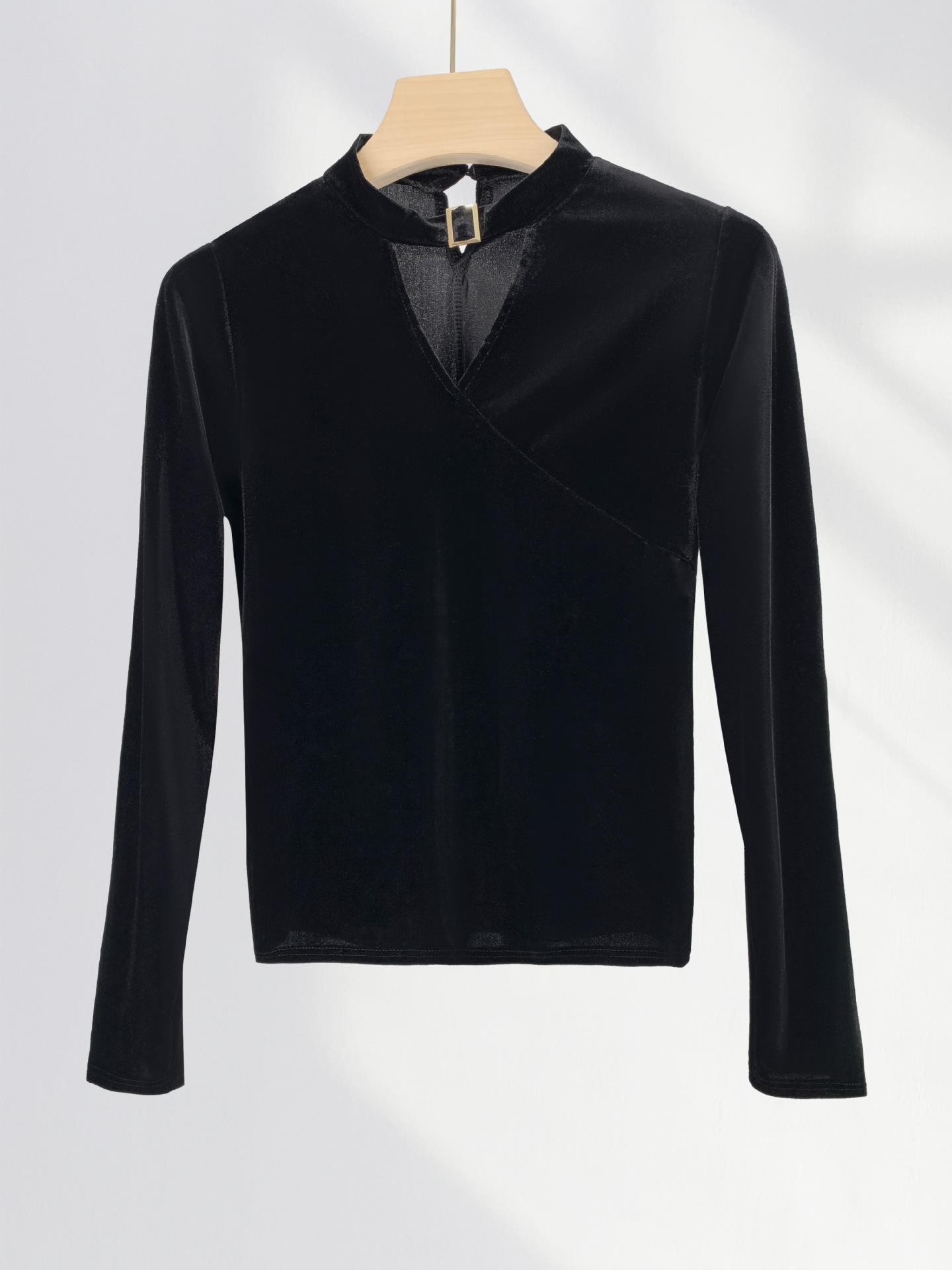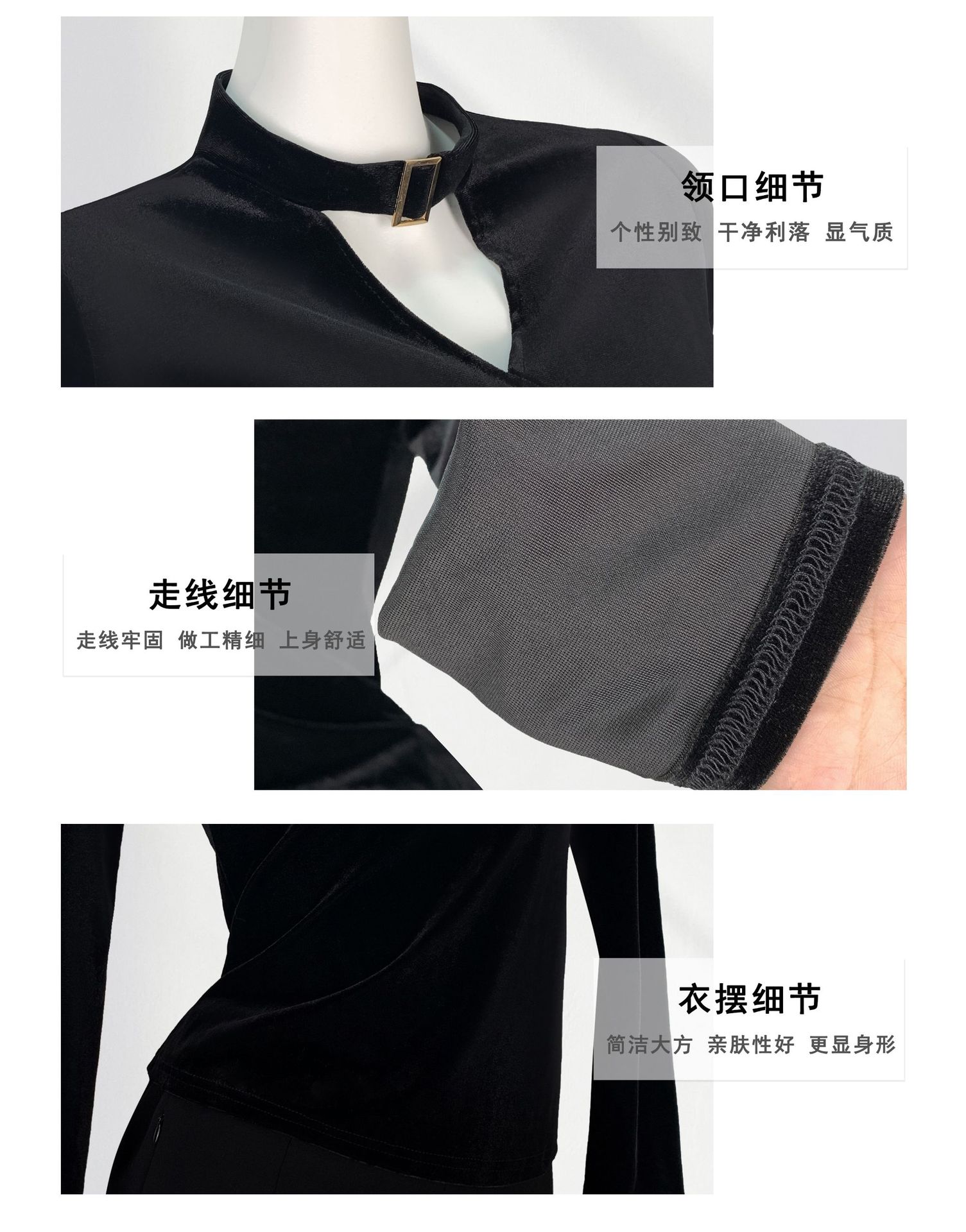 Beleza Estilo Retrô de Hong Kong Veludo Preto Dourado Top Slim Decote V Sexy Camiseta de Manga Comprida com Camiseta Básica Novo Estilo Outono