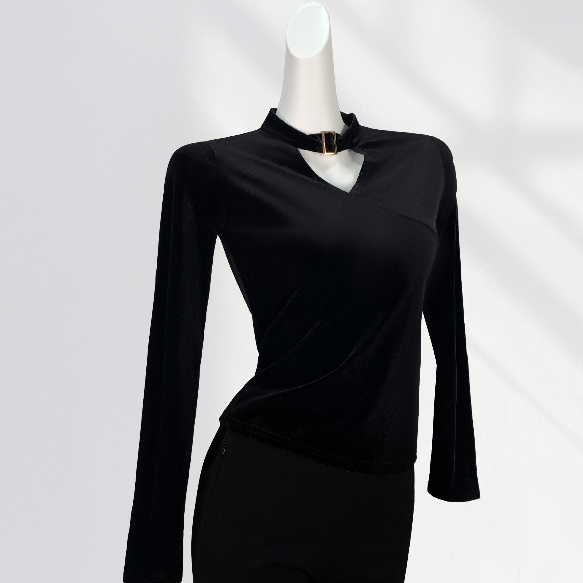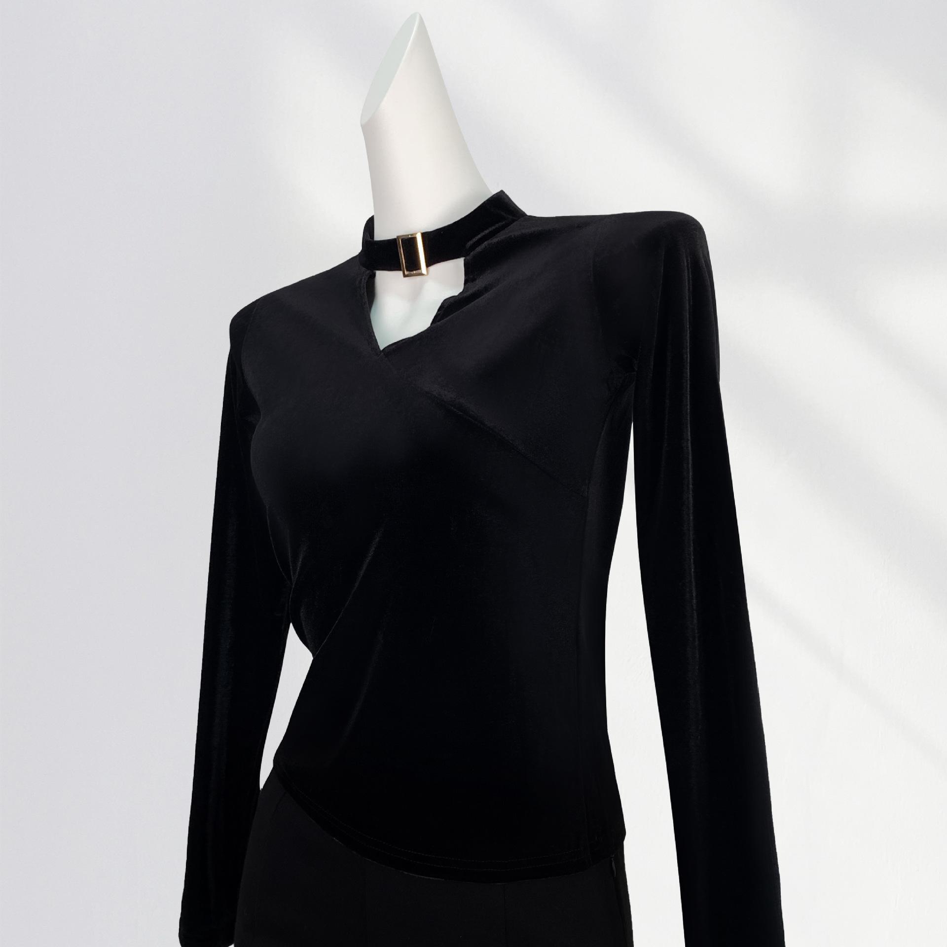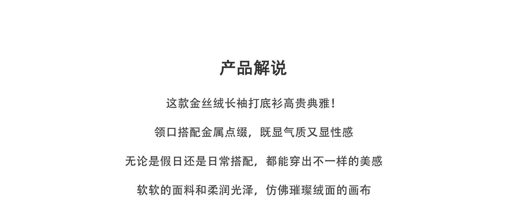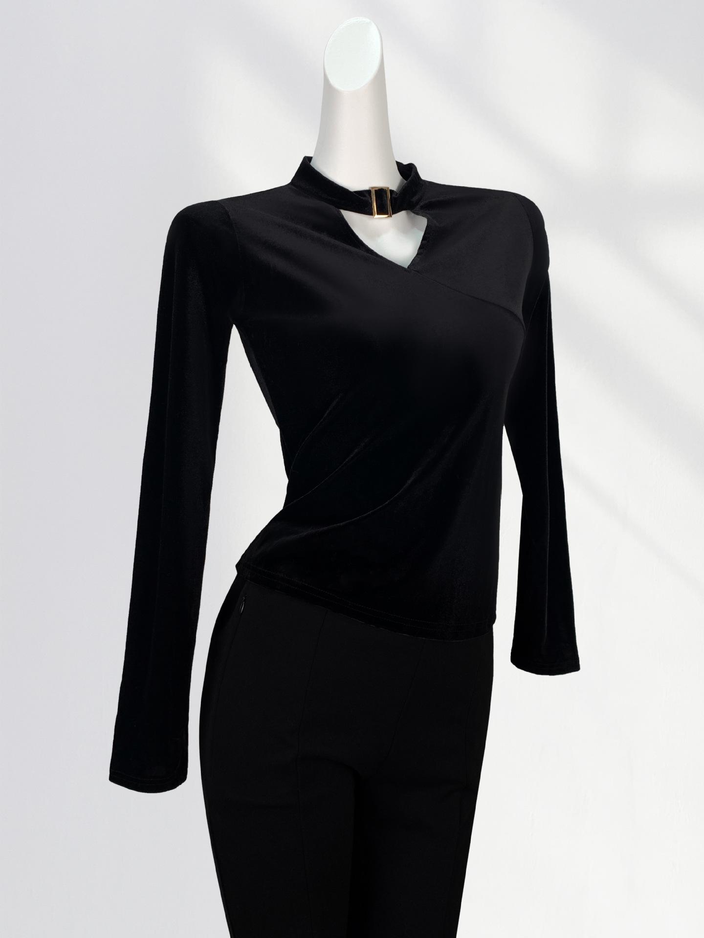 Beleza Estilo Retrô de Hong Kong Veludo Preto Dourado Top Slim Decote V Sexy Camiseta de Manga Comprida com Camiseta Básica Novo Estilo Outono