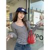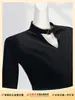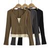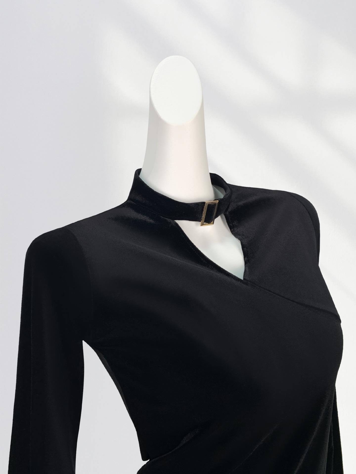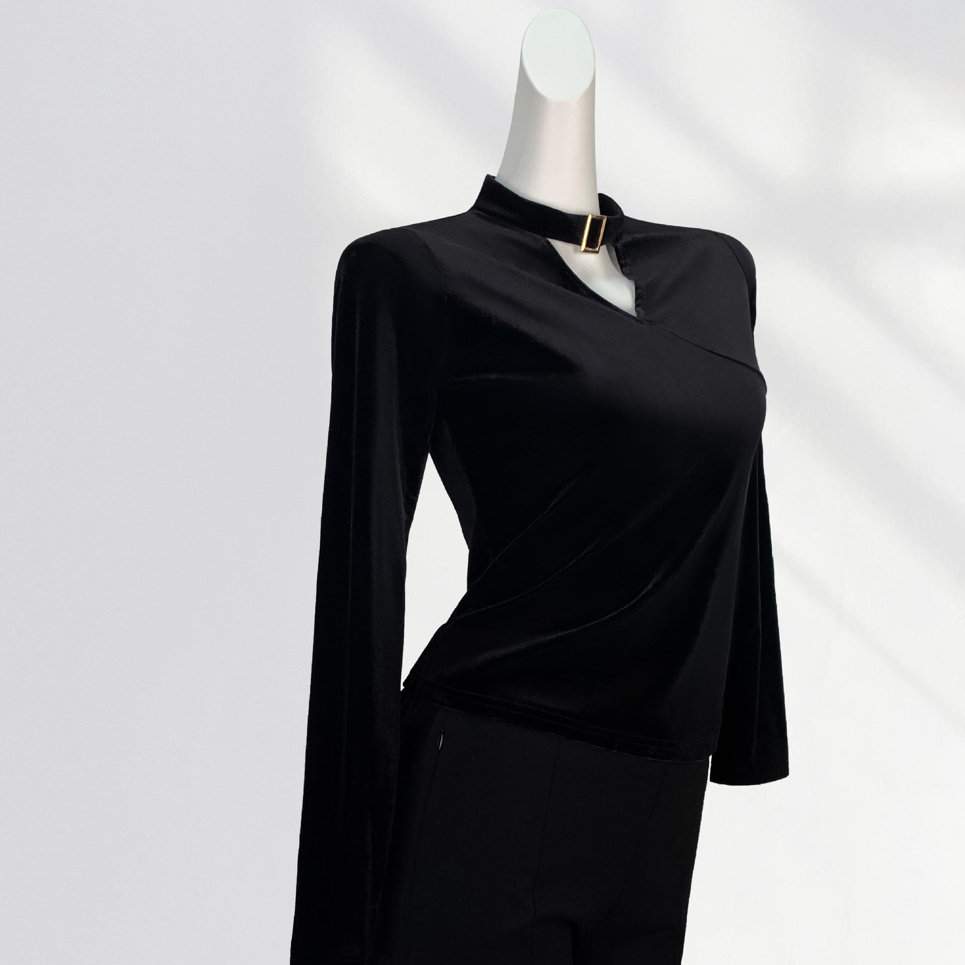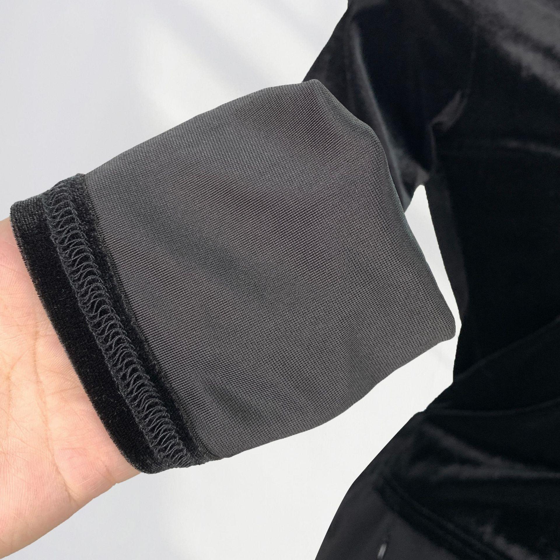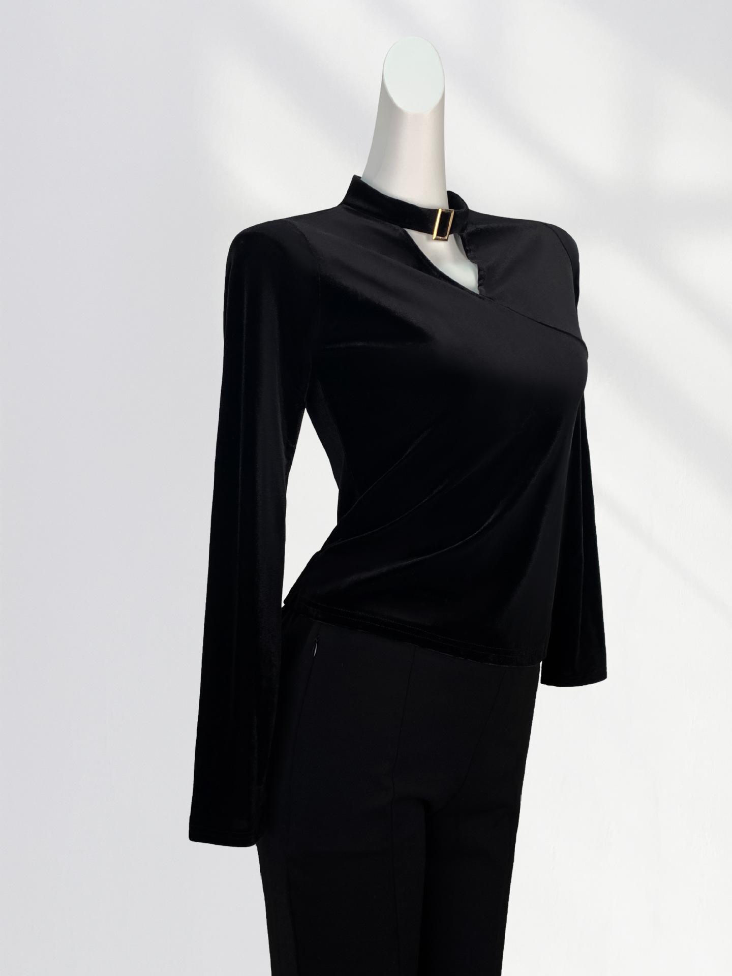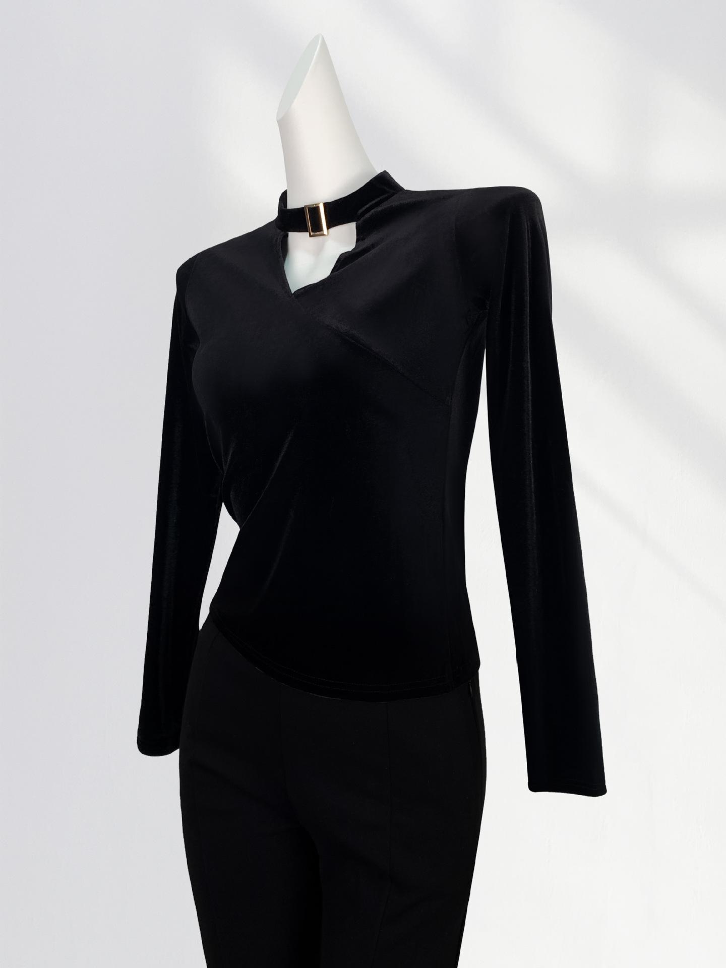 Beleza Estilo Retrô de Hong Kong Veludo Preto Dourado Top Slim Decote V Sexy Camiseta de Manga Comprida com Camiseta Básica Novo Estilo Outono