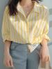 Camisa listrada vertical amarela e branca Camisa Feminina 2024 Início da Primavera Camisa Novo Estilo Estilo Europeu Estilo Ocidental Camisa Pequena Explosões Camisa Protetor Solar à Beira-Mar