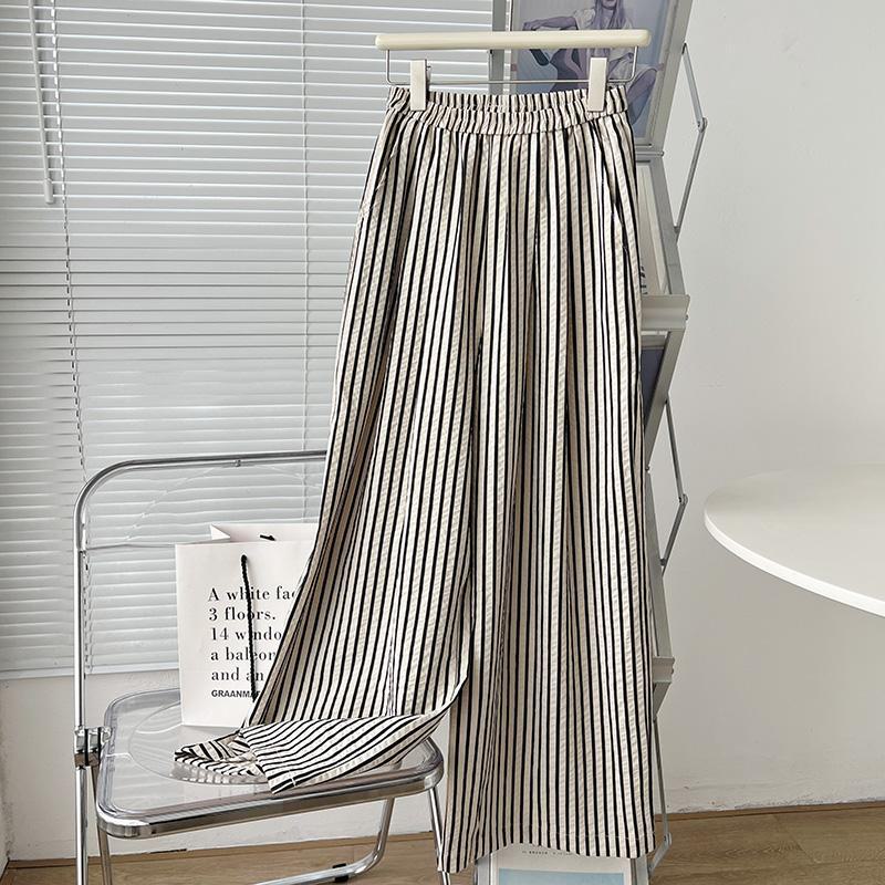 Calças Listradas Texturizadas de Perna Larga para Mulheres 2025 Verão Novo Cintura Elástica Versátil Calças Casuais Soltas Retas Longas