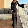 2023 novo cross-border preto rendado slim vestido de cetim outono comércio exterior feminino vestido de bainha manga sino
