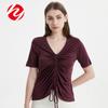 Huaye Verão Novo Estilo Seda Decote V Manga Curta Camiseta Feminina Camisa Slim e Estilosa Cordão Top Tricotado de Seda de Amora