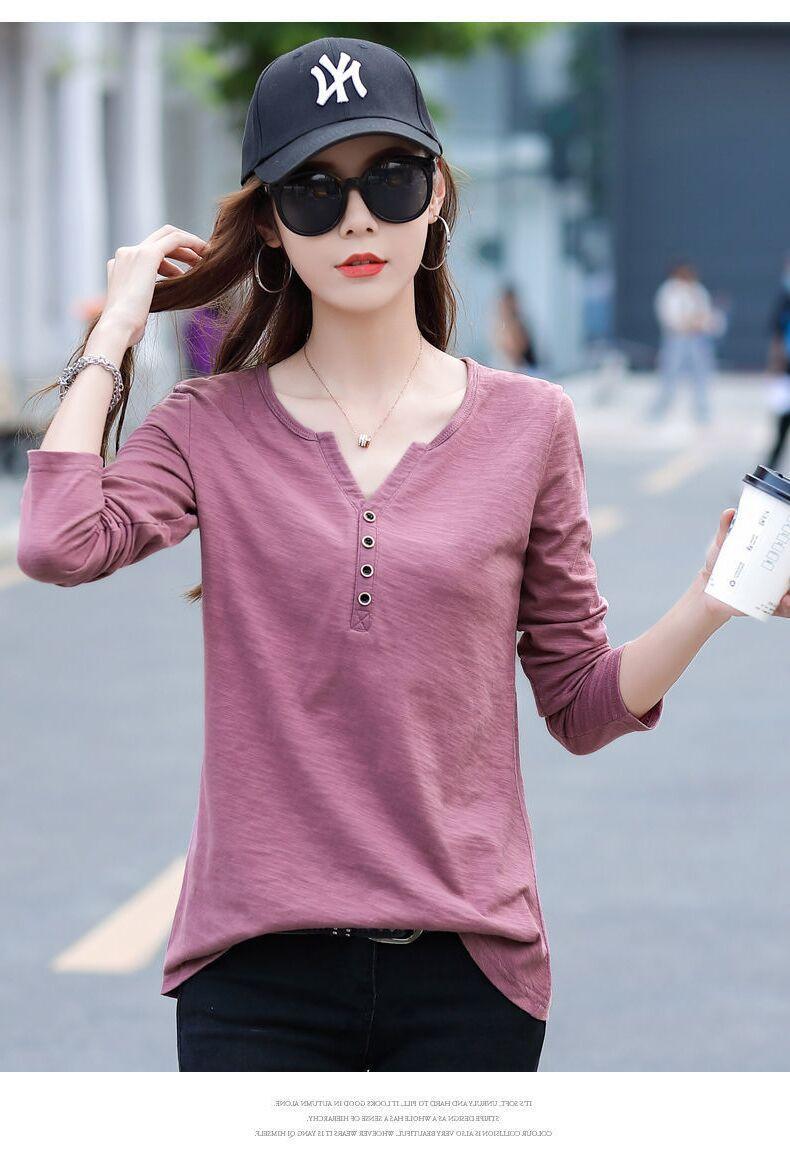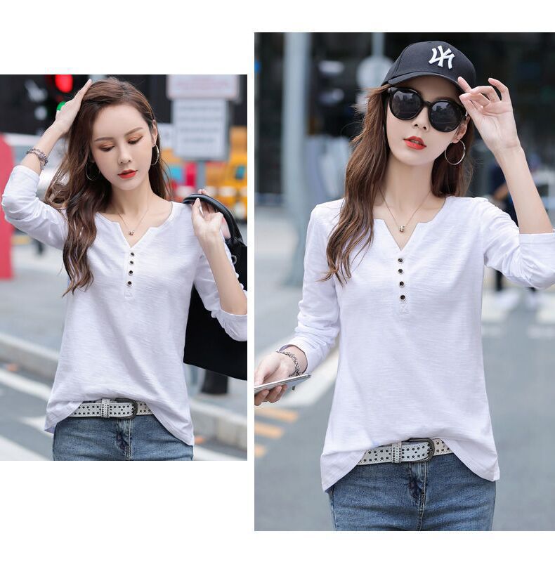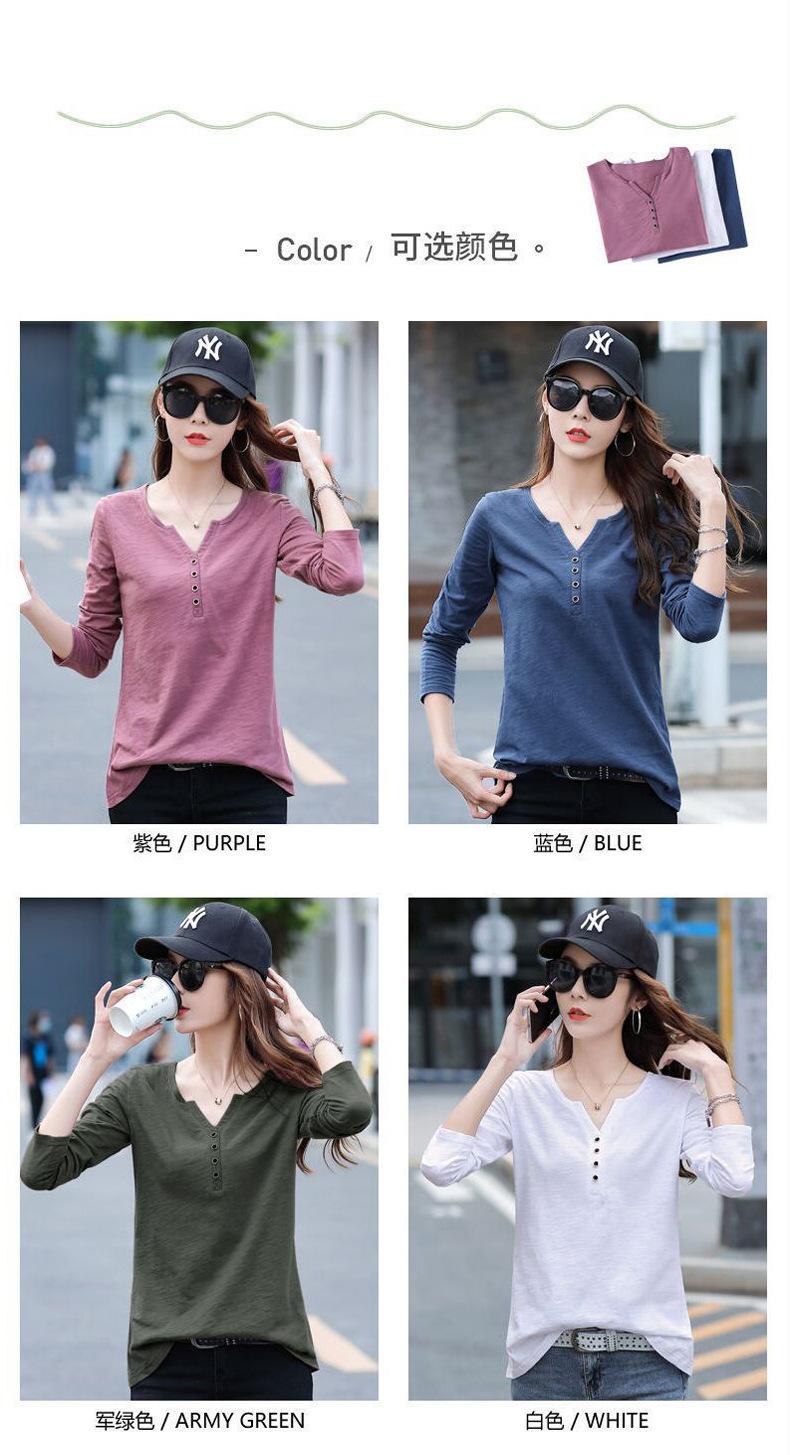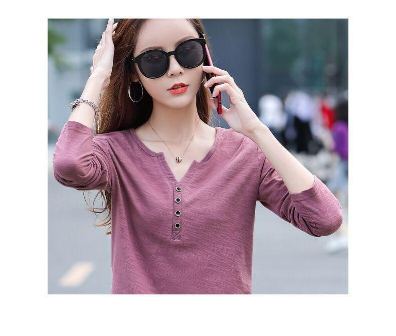 Camiseta feminina de 5 cores de algodão de manga comprida 2022 novo estilo coreano outono e inverno botão V-neck top bottoming shirt