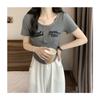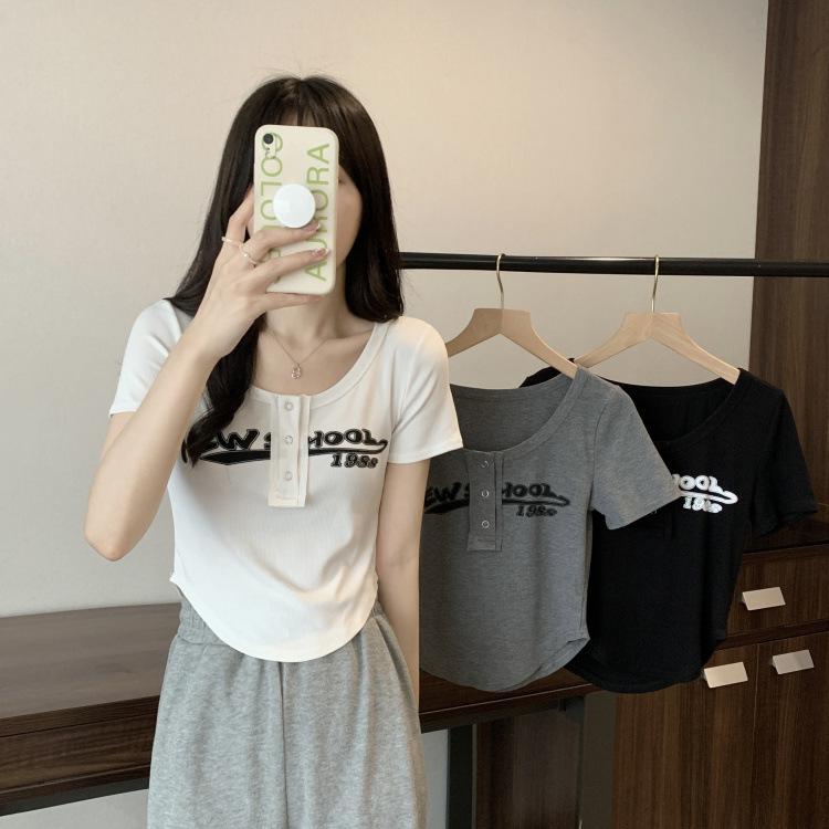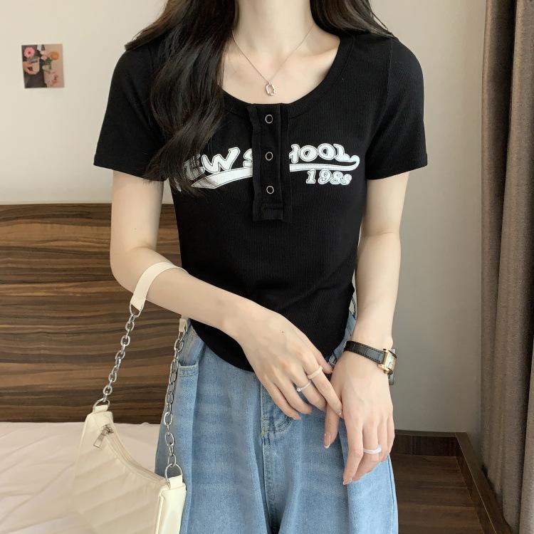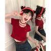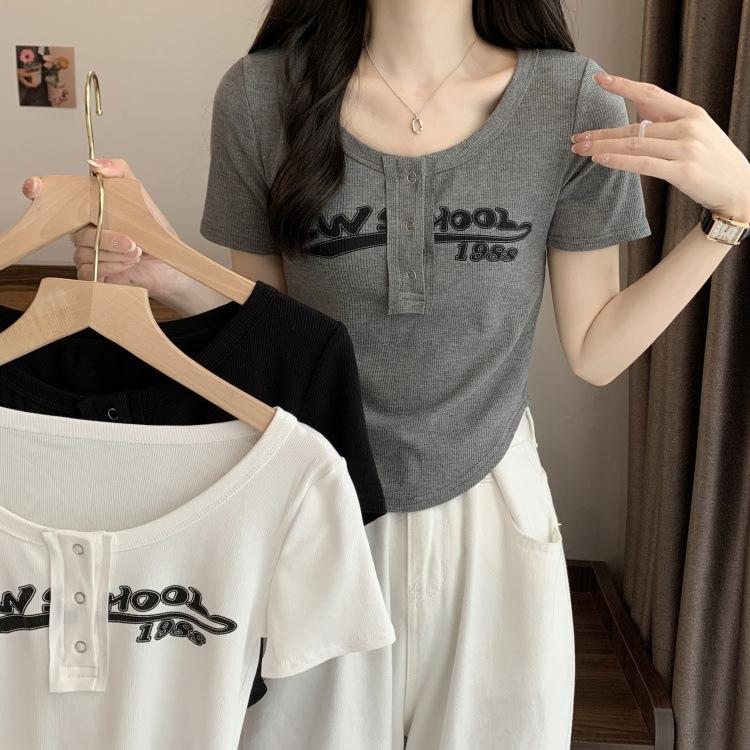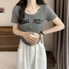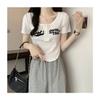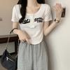 Camiseta Feminina de Manga Curta Canelada com Estampa de Letras Doce e Picante, Top Ninho e Chique de Verão com Caimento Curto e Slim